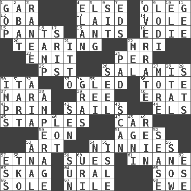 ACROSS 1. Slender fish 4. Otherwise 8. Cassini of fashion 12. Chief or king in Benin or Nigeria 13. Put down 14. Grand slam 15. Leg coverings 18. Pismires 19. Singer Brickell 20. Rending 22. Medical imaging device (abbr.) 23. Give off 24. For each 25. Pacific Standard Time (abbr.) 26. Deli grouping 30. Call ___ day 33. Stared at amorously 36. Carry 37. Hindu Mythology: god of death 39. Portuguese money of account (variant) 40. Part of Q.E.F. 41. Demure 42. Moves on water 44. Raised railways 45. Paper fasteners 47. Automobile 50. Period of immesurable duration 51. Grows older 53. Nonscientific branch of learning 54. Simpletons 57. Inactive volcano in Sicily 59. Institutes legal proceedings 61. Silly 63. Heroin 64. Mountain range 65. Distress signal 66. Flatfish 67. The longest river in the world 68. She-sheep DOWN 1. Grand Old Party 2. Blind as ____ 3. Indian princess (variant) 4. Enthusiasm 5. Long (Scottish) 6. Be seated 7. Begley and Asner 8. Make much ado about nothing 9. Farming town in central California 10. Connecticut Ivy Leaguer 11. Turn to the right 16. Pack (down) 17. Indian titles of respect 21. "Tell ____ the Marines!" 22. Cartoonist voice _ Blanc 24. Writing tablet 26. Stitch closed the eyes of (a falcon) 27. Greater amount 28. Slanted text style (abbr.) 29. Puts into a specified state 30. Naughty children 31. Small pie 32. Roberta Peters solo 34. Pate de foie ____ 35. Luau accessory 38. Electrical Measurement 42. Elected rep. 43. Examine hastily 46. Car dealer's back yard 48. Hindu god of fire 49. It's straight from the horse's mouth 52. Gospel singer Marvin 53. Of or related to the anus 54. Be tempered by heat 55. Small island 56. Overwhelm 57. Double-curved letter 58. Ring climax 59. Player for Phoenix 60. RI univ. 62. Compass dir.