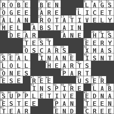 ACROSS 1. Loose flowing garment 5. Benjamin's nick name 8. Fails to keep up a pace 12. Double curve, resembling the letter S 13. "We ___ not amused" (Victoria) 14. It is permitted: Lat. 15. Actor Alda or Thicke 16. Rotating or pertaining to rotation 19. Cartoonist voice _ Blanc 20. Refrain by choice 21. Letter starter 23. One (Scot) 24. Part of HMS, perhaps 27. Trial 30. Suggestive of the supernatural 31. Motion picture awards 34. Dec. holiday 35. Lick closed 38. Lacking in sense or substance 40. Is not 41. Hang loosely or laxly 42. Centers of feelings and intuitions 44. Washington bills 45. Piece 46. Compass dir. 47. Portuguese money of account (variant) 50. One who uses or employs something 53. Heighten or intensify 57. Experiment locale 59. Supplying deficiencies 63. Pulitzer Prize-winning author Ferber 64. First name in cosmetics 65. Baking dish 66. Adolescent 67. Separate forcefully 68. Conclusion 69. Algonquian DOWN 1. Wander 2. Stared 3. Calif. Air Force Base 4. Car or cant ending 5. Sharp remark 6. Greek god of love 7. Remaining after all deductions 8. 54 in ancient Rome 9. Adept person 10. Set 11. Filthy place 14. Actor's bit 17. American Automobile Association (abbr.) 18. Shallow baking pan 20. Ancient Greek god of war 22. Ringlike coral islands and reefs 24. Is hesitant and indecisive 25. SW Asia republic 26. System (abbr.) 28. _-fi 29. Hyperbolic tangent 30. Has an existence 32. Actress Charlotte 33. Fastener 35. _ gin 36. Immeasurably long periods of time 37. Toward shelter 39. Epoch 43. Loyal 47. Cause heat under the collar 48. Compass dir. 49. Eastern Standard Time (abbr.) 51. A person who is older than you are 52. Indian princess (variant) 54. Corncob 55. "Terrible" tsar 56. Tear apart 58. Object of repulsion 59. Arrange properly for use 60. Purpose 61. Parent Teacher Association (abbr.) 62. For each 63. And so on (abbr.)