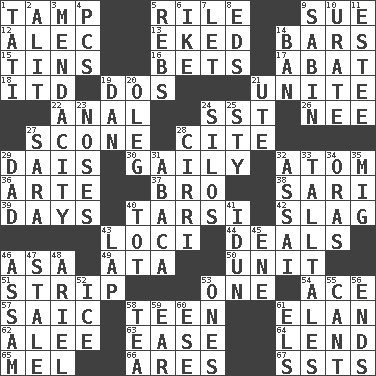 ACROSS 1. Pack (down) 5. Cause heat under the collar 9. Take to court 12. Actor Baldwin 13. Made supply last 14. Long, evenly shaped pieces 15. Canisters 16. Antes 17. Blind as ____ 18. It would 19. Two (Sp.) 21. Join together 22. Of or related to the anus 24. Fast jet (abbr.) 26. Born 27. Biscuitlike quick bread 28. Quote 29. Raised platform 30. Lightheartedly 32. Tiny particle 36. Johnson of "Laugh-In" 37. Sis' sibling 38. Indian skirt 39. 24-hour periods 40. Tarsus (plural) 42. Volcanic refuse 43. Venues 44. Allots cards 46. White ___ sheet 49. "One Day ___ Time" 50. A single undivided whole 51. Long narrow piece of something 53. Single 54. Adept person 57. Ketch in the Levant 58. Adolescent 61. Style 62. Toward shelter 63. Relaxation 64. Grant temporary use of 65. Cartoonist voice _ Blanc 66. Ancient Greek god of war 67. Fast planes DOWN 1. Jacques of French films 2. Came down and settled, as after flight 3. Ananias' fault 4. Personal Computers (abbr.) 5. Confederate soldiers (slang) 6. D.D.E's nickname 7. Allow 8. Begley and Asner 9. Unit of acoustic absorption 10. A salt of uric acid 11. First name in cosmetics 14. Forbid 19. Daniel's nick name 20. Cassini of fashion 21. Shoshoni 23. Olfactory organs 24. Grain storage towers 25. Filthy place 27. "Two Mules for Sister ____" 28. High-altitude cloud 29. June honoree 31. Phillipine bananalike plant 32. Slender Brazilian palm 33. Baron Munchausen's specialties 34. Mouths or openings 35. Russian fighter aircraft 40. Small child 41. Goddess of spring and wife of Bragi 43. Pet locale 45. Compass dir. 46. Indian state 47. Showing deterioration from age 48. Satellite of Uranus 52. Frozen water 53. Singles 55. Patter 56. Extremities 58. Afternoon social gathering 59. Ewer handle 60. Compass dir. 61. Raised railways