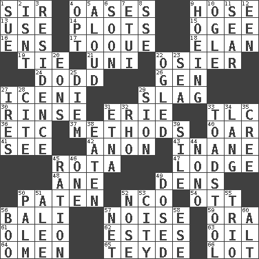ACROSS 1. Title for a knight 4. Fertile tracts in a desert 9. Flexible conduit 13. Purpose 14. Graphs 15. Double curve, resembling the letter S 16. Followers of ems 17. Woman's close-fitting hat 18. Style 19. Make a knot 21. University (slang) 22. Flexible twig of a willow tree 24. Texas town _ City 26. Commissioned mil. rank 27. Ancient Celtic tribe of eastern Britain 29. Volcanic refuse 30. Remove soap 31. 4th largest of the Great Lakes 33. Affectionate concern, for short 36. And so on (abbr.) 37. Modes 40. Rowing implement 41. Perceive with the eye 42. Soon (poet.) 43. Lacking in sense or substance 45. Round or rotation of duties 47. Inn 48. A saturated hydrocarbon 49. Habitations of wild animals 50. Eucharist need 52. Non-commissioned officer (abbr.) 54. Baseball player Mel 56. Indonesian resort city 57. Annoying sound 59. Mouth or opening 61. Butter sub 62. _____ Park, CO 63. Petroleum 64. Sign of things to come 65. Miss Universe 1986, Barbara Palacios _ 66. Car dealer's back yard DOWN 1. Institute legal proceedings 2. Is not 3. Home 4. Elect 5. Verbally 6. Within a short period 7. Needle case 8. Compass dir. 9. Weeding 10. Stare at amorously 11. Singe 12. Car or cant ending 20. Immeasurably long periods of time 22. Stared at amorously 23. Ocean 25. South Vietnam president (1954) 27. Angers 28. Quote 29. The Jewish people; Israel 31. Inactive volcano in Sicily 32. 17th letter of the Greek alphabet 33. Inedible or poisonous agaric 34. Long (Scottish) 35. Algonquian 38. Consumed 39. Filth; sediment 44. Words to Nanette 45. Food allowance for one day 46. Single 49. Administered medicine 50. Inside of hand 51. Toward shelter 52. Characteristic smell of wine 53. Municipality 55. Musical group of three 56. Surprise greeting 57. Fish or hair follower 58. Compass dir. 60. Keyboard modifier key