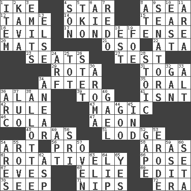 ACROSS 1. Mamie's husband 4. Play the lead 8. At sea 12. Not wild 14. Migrant worker of the '30s 15. Pull into pieces 16. Morally bad or wrong 17. Unrelated to defense, as in spending 20. Floor protectors 21. Bear (Spanish) 22. _ moment's notice (2 wds.) 23. Theater features 27. Trial 29. Roll call or roster of names 31. Ancient Roman robe 34. Following 35. Of the mouth 36. ____ Jay Lerner 39. Coat; cloak 41. Is not 42. Court order 43. Mysterious quality of enchantment 46. Root beer relative 47. Period of immesurable duration 48. Mouths or openings 51. Cabin 54. Tate display 56. Adept person 58. Caspian sea tributary 61. Happening in regular succession 66. Airs 67. Nights before holidays 68. Writer Wiesel 69. Prepare for publication 70. Ooze 71. Pinches, bites 72. Period DOWN 1. A distinct part 2. Polynesian shrub of the pepper family 3. Gives off 4. Male offspring 5. Ring climax 6. The 18th letter of the Arabic alphabet 7. Make new 8. Had dinner 9. Elected representatives 10. Compass direction 11. Type of rug 13. Otherwise 18. Eastern Standard Time (abbr.) 19. Enemy 24. Sandy's bark 25. Small child 26. Proofreading order 28. Unemotional 30. Scent 32. Separate the seeds from cotton 33. The first octave above the treble staff 34. Approach 36. Curve 37. Nilotic language 38. One to whom something is allotted 40. Highlander 44. Thick or sticky substance 45. Working for oneself (abbr.) 49. Fitting 50. Indian title of respect (Mr.) 52. Yawn 53. Wear away 54. Ancient Greek god of war 55. Be footloose 57. Baking chamber 59. SW Saudi Arabia district 60. Bristle 62. Viper 63. Biblical high priest 64. Mouth edge 65. It is so
