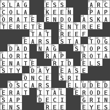 ACROSS 1. Volcanic refuse 5. Curvy letter 8. Curve 11. Root beer relative 12. Peachy ____! 14. Infant food 15. Speak pompously 17. Inside; within (prefix) 18. "____ silly question..." 19. Cylindrical with tapered ends 21. Main course 23. Make lace 25. Coral ridge 26. Hearing organs 27. R.R. building 28. Coat; cloak 31. Male parent 33. Tired old horse 35. Constricts 37. Australian parrot (variant) 38. Strike 40. Roll call or roster of names 41. Related on the mother's side 43. To free from 45. Raised railways 46. Filthy place 47. 24 hours 50. Comfort 52. Single time 53. _ Lanka 54. Motion picture awards 56. Evaded 61. Part of Q.E.F. 62. Slanted text style (abbr.) 65. Eat (away) 66. Plant excrement 67. Tenth: prefix 68. Smile widely 69. Followers of ems 70. Portuguese money of account (variant) 71. Sight organs DOWN 1. Highlander 2. Old wives' tales, e.g. 3. Having or resembling wings 4. Yard entry 5. Make supply last 6. Elected rep. 7. Spring feasts 8. Domed church section 9. Libertine 10. Numbers guy (abbr.) 13. Music written for nine 16. Singer James 18. Sandy's bark 20. Merit 22. Beverages made from leaves 24. Russian ruler of old 26. Prepare for publication 28. Implement 29. Elects 30. Girls' org. (abbr.) 31. Do not 32. Like ___ of sunshine 34. Slender fish 36. Family _ (genealogy) 37. French article 39. Sliced desserts 42. Pulitzer Prize-winning author Ferber 44. Have the gumption 48. Sour-tasting 49. Last past 51. Drop; flow; fall 52. Sep. follower 54. NW Algerian seaport 55. Plant excrements 57. Goad 58. Dinghy 59. Singer Brickell 60. Lairs 61. Compass dir. 63. Adept person 64. Falsehood