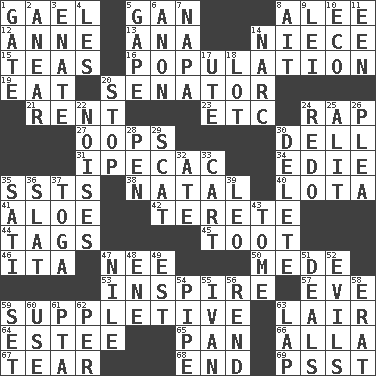 ACROSS 1. Highlander 5. Separate the seeds from cotton 8. Toward shelter 12. Queen of England 1702-14 13. Santa ___, CA 14. Sibling's daughter 15. Afternoon social gatherings 16. Census information 19. Consume 20. Elected representative 21. Monthly bill 23. And so on (abbr.) 24. Hit sharply and swiftly 27. I made a mistake 30. Small valley 31. Medicinal drug used to evoke vomiting 34. Singer Brickell 35. Fast planes 38. Brizilian seaport 40. Globular water bottle used in Asia 41. _ vera 42. Cigar-shaped 44. Labels 45. A blast of a horn 46. Call ___ day 47. Born 50. Ancient Persian 53. Stimulate to action 57. First lady 59. Supplying deficiencies 63. Den 64. First name in cosmetics 65. Baking dish 66. Silent film actress Nazimova 67. Separate forcefully 68. Conclude 69. Inconspicuous attention getter DOWN 1. Yard entry 2. Approach 3. Related on the mother's side 4. French article 5. Yawn 6. At once, immediately (arch.) 7. California wine valley 8. Small island 9. Flowery wreath 10. Environmental prefix 11. Car or cant ending 14. Drug cop 17. Shoshoni 18. Car dealer's back yard 20. Halt 22. Annoying sounds 24. Make new 25. Came down and settled, as after flight 26. Entreaty 28. Animal enclosure 29. Scram! 30. Keyboard key 32. Had dinner 33. Heavy open wagon 35. Suttee (variant) 36. Narrow board 37. Ancient Roman robe 39. Lion 43. Heavy book 47. Mediterranean tributary 48. Compass dir. 49. Eastern Standard Time (abbr.) 51. Allots cards 52. Vices 54. Corncob 55. _ the terrible 56. Tear apart 58. Part of Q.E.F. 59. Arrange properly for use 60. Purpose 61. Parent Teacher Assoc. 62. For each 63. Infant locale