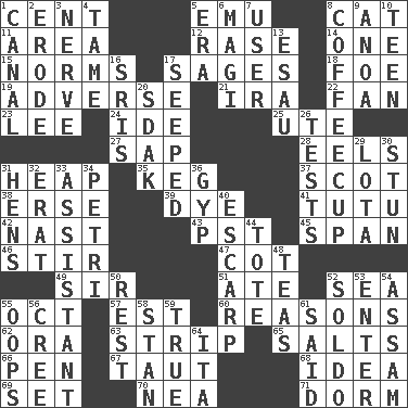 ACROSS 1. Penny 5. Australian flightless bird 8. Feline 11. Length times width 12. To erase 14. Single 15. Typical standards 17. Gurus 18. Enemy 19. Contrary to your interests or welfare 21. Retirement account (abbr.) 22. Avid follower 23. Area sheltered from the wind 24. Binary compound 25. Shoshoni 27. Plant excrement 28. Snakelike fish 31. Pile 35. Barrel 37. Native of Scotland 38. Celtic language 39. Color 41. Ballerina skirt 42. Political cartoonist Thomas 43. Pacific Standard Time (abbr.) 45. Connect, as a bridge 46. Move through with a circular motion 47. Small bed 49. Title for a knight 51. Had dinner 52. Ocean 55. Sep. follower 57. Eastern Standard Time (abbr.) 60. Thinks logically 62. Mouth or opening 63. Empty completely 65. Table seasonings 66. Fenced enclosure 67. Strained 68. The content of cognition 69. Put into a specified state 70. Teachers' org. 71. Dormintory (informal) DOWN 1. Lessep's creation 2. Wear away 3. Boldness 4. Not wild 5. Epoch 6. Wise men 7. One who makes use of a thing 8. Java holder (2 wds.) 9. Small Philippine buffalo 10. Adolescent 13. Son of Isaac 16. Indian titles of respect 17. Oozed 20. Neighbor of Neb. 26. Trials 29. Globular water bottle used in Asia 30. Make senseless or dizzy 31. Coop moms 32. Part of Q.E.F. 33. Helper 34. _ dish (used to culture cells) 36. Hustle 40. Fortification 44. Carry 48. Beverages made from leaves 50. Respite 52. Twentieth part of a lira 53. Keyboard key 54. Indian state 55. I made a mistake 56. Algonquian 58. Comedian Laurel of Laurel & Hardy 59. Loyal 61. Alleged 64. Call ___ day