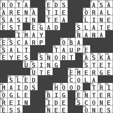 ACROSS 1. Roll call or roster of names 5. Begley and Asner 8. White ___ sheet 11. Sports stadium 13. Neckwear 14. Of the mouth 15. Indian antelope 16. Beverage made from leaves 17. Actor's bit 18. Eastern Standard Time (abbr.) 19. Mild oath 21. Chalkboard 22. "If ____ say so..." 24. Nanny 25. Fortification 27. Chief or king in Benin or Nigeria 29. Table seasoning 30. Grayish beige 32. Sight organs 33. Derisive sound 35. "____ silly question..." 39. Exploiting 41. Proofreading order 42. Shoshoni 43. Develop 45. Downhill vehicle 48. Root beer relative 49. Unmarried girls 50. Parka part 52. Three (prefix) 55. Stare at amorously 56. Of large size 57. Keyboard key 59. It's straight from the horse's mouth 60. Binary compound 61. Biscuitlike quick bread 62. Curvy letter 63. Born 64. Washington bills DOWN 1. To erase 2. Mouths or openings 3. A testis 4. Cuckoo 5. Singer James 6. Passed on 7. Ocean 8. Believer in; advocate of (suffix) 9. Before Barbara or Clara 10. Toward shelter 12. Approach 14. Spanish pot 20. Hustle 21. Fastener 23. Taiwanese island in East China Sea 25. Compass dir. 26. Declare 27. Boat paddle 28. Yet 30. Coat; cloak 31. Artist's stand 33. Be seated 34. Compass dir. 36. Ski resort town in Vermont 37. Cask 38. Had dinner 40. Beer foam 43. Environmental prefix 44. Methods 45. Gurus 46. Ms. Damita and namesakes 47. Locale of original sin 49. Greater amount 50. Flintstone garb 51. Double curve, resembling the letter S 53. French philosopher Descartes 54. Angers 56. Storage container 58. Non-commissioned officer (abbr.)