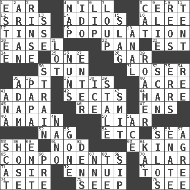 ACROSS 1. Ewer handle 4. Place where flour is made 8. An absolute certainty 12. Indian titles of respect 14. Goodbye (Sp.) 16. Toward shelter 17. Canisters 18. Census information 20. Artist's stand 22. Baking dish 23. Eastern Standard Time (abbr.) 24. Compass dir. 25. Single 28. Slender fish 30. Astound 31. Failure 35. Fitting 37. Nuclear Threat Initiatives 40. Measure of real estate 41. The sixth month of the Jewish calendar 42. Religious groups 44. Female horse 45. California wine valley 46. 480, 500 or 516 sheets of paper 47. Followers of ems 48. With great haste 50. One who doesn't tell the truth 52. Tired old horse 54. And so on (abbr.) 55. Ocean 58. A female animal or person 61. Dreamland 63. Supplementing with great effort 65. Parts 70. Having or resembling wings 71. SW Saudi Arabia district 72. World-weariness 73. Carryall 74. Wig 75. Ooze 76. Perceive with the eye DOWN 1. First name in cosmetics 2. Believer in; advocate of (suffix) 3. Remove soap 4. Atlas unit 5. Wedding promise 6. Mouth edge 7. Central Nebraska county 8. Domesticated feline 9. Writer Wiesel 10. Vintage cars 11. Portable shelter 13. Compass dir. 15. Volcanic refuse 19. Of or related to the anus 21. Car dealer's back yard 26. Religious women 27. Keyboard key 29. Nomad 30. Put through a sieve 32. Examine hastily 33. Blunders 34. To riddle 35. First of billions? 36. Dad 38. Frozen water 39. Showing deterioration from age 41. Santa ___, CA 43. Stricken, poetically 49. Billionth: prefix 51. Adept person 53. Went 55. Grain storage towers 56. Maternal 57. Match 58. Get outta here! 59. Flexible conduit 60. Send forth 62. Hiding places for outlaws 64. Krazy ___ of comics 66. Before (prefix) 67. Compass dir. 68. Third day of the wk. 69. Small drink