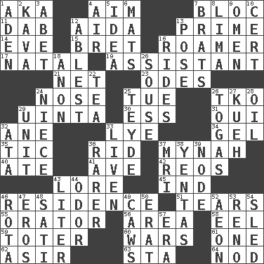 ACROSS 1. Alias (abbr.) 4. Direct toward a target or goal 7. Group of countries in special alliance 11. Pat or tap gently 12. Opera by Verdi 13. A-one 14. Night before a holiday 15. Cy Young winner Saberhagen 16. Wanderer 17. Brizilian seaport 19. Helper 21. Fish or hair follower 23. Lyric poems 24. Olfactory organ 25. Third day of the wk. 26. Ring climax 29. National forest in Provo, Utah 30. Double-curved letter 31. Fr. "Yes" 32. One (Scot) 33. Potassium hydroxide 34. Set 35. Nervous spasm 36. To free from 37. Non-adult bird? 40. Had dinner 41. "___ Maria" 42. Vintage cars 43. Old wives' tales, e.g. 45. Indiana (abbr.) 46. Home 51. Rends 55. Speaker 56. Type of rug 58. Snakelike fish 59. Carrier 60. Armed conflicts 61. Single 62. SW Saudi Arabia district 63. R.R. building 64. Allow head to fall sleepily DOWN 1. Arabian gulf 2. Polynesian shrub of the pepper family 3. Collude with 4. Atmosphere 5. The main thing one is thinking about 6. Floor protectors 7. Naughty children 8. Pale green bean 9. Presage 10. Foregone conclusion 12. Most capable 13. Introduce or present, as a question 16. Amusement-park features 18. Soon (poet.) 20. Lush 22. Beverage made from leaves 24. Sibling's daughter 25. Miss Universe 1986, Barbara Palacios _ 26. Ancient Roman robes 27. Malaysian steamed pastry 28. Petroleum 29. A single undivided whole 32. "One Day ___ Time" 33. Make or become more lively 36. More valued for its uncommonness 37. Medical imaging device (abbr.) 38. Gossips 39. Connecting point 43. 61 cubic inches 44. Aroma 46. Roll call or roster of names 47. Greek god of love 48. Suttee (variant) 49. Crow sounds 50. Part of Q.E.F. 52. Age 53. Former U.S. Attorney General Janet 54. Downhill vehicle 57. Period