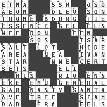 ACROSS 1. Inactive volcano in Sicily 5. Compass dir. 8. Bear (Spanish) 11. Age 12. Butter sub 14. Boy, to dad 15. Heavy duty weighing machine 17. Town 18. Standoff 19. Substance 21. Set 22. Raised railways 23. Born 24. Spanish title 25. Car or cant ending 27. Mayday 28. Russian ruler of old 31. Table seasoning 35. Car dealer's back yard 37. Flintstone garb 38. Type of rug 39. Teachers' org. 41. _ the terrible 42. Play the lead 43. Compass dir. 45. Foregone conclusion 46. Puts into a specified state 47. Biblical high priest 49. Part of HMS, perhaps 51. River (Sp.) 52. Followers of ems 55. Supplement with great effort 57. Australian flightless bird 60. Commissioned military rank 62. Slender fish 63. Offensive 65. Before Barbara or Clara 66. "___ Maria" 67. Relationship diagram 68. Thailand, formerly 69. June honoree 70. Period 71. Snakelike fish DOWN 1. Consumed 2. Laconic 3. Trap for birds or small mammals 4. Singer Murray 5. "Barney Miller" actor Jack 6. A hard, heavy blow 7. Past tense of be (plural) 8. Clearly or manifestly demonstrative 9. Land 10. Washington bills 13. Stare 16. Conclusions 17. Gillaume's butler role 20. Calm and collected 26. Value system 29. The sixth month of the Jewish calendar 30. Monthly bill 31. Backtalk 32. Johnson of "Laugh-In" 33. Tough but pliablecoriaceous 34. Tarsus (plural) 36. Nine, plus one 40. Disorder of the immune system 44. Writer Wiesel 48. Charged particles 50. Emitted 52. Bert's buddy 53. Brizilian seaport 54. Criticizes harshly 55. Mild oath 56. Polynesian shrub of the pepper family 58. Female horse 59. One who makes use of a thing 61. Relaxation 64. Beverage made from leaves