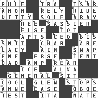 ACROSS 1. Whine 5. Lyricist Gershwin 8. Russian ruler of old 12. At once, immediately (arch.) 13. Have trust in 15. Travel on an animal 16. Short, simple song 18. Flatfish 19. Like ___ of sunshine 20. To sift 22. More lively and spirited 24. Otherwise 26. Small child 27. Flats, for short 28. Corporate head (abbr.) 29. Twice 32. In a ____ (agitated or irritated) 35. Burn to charcoal 37. "We ___ not amused" (Victoria) 38. Made of lace 39. Direct toward a target or goal 40. Fastener 41. Compass dir. 42. Celtic language 43. Portable shelter 44. Male parent 45. Electrical Unit 46. Located in or toward the back 49. Frozen water 50. Inventor's middle name 51. Commissioned military rank 55. Be seated 56. Calm and collected 57. Small, secluded valley 59. Closes up, plugs up 63. Singer Murray 64. Relaxation 65. Mitch Miller's instrument 66. Trial 67. Call ___ day 68. Nathan's nickname DOWN 1. Groovy apt. 2. Single; one (prefix) 3. Car dealer's back yard 4. Plea 5. Big collection agency 6. Vintage cars 7. Silent film actress Nazimova 8. Distinguishing feature 9. The founder of a family 10. The sixth month of the Jewish calendar 11. Marina Del _, California 14. Next before 17. Sharp bark 21. Eastern Standard Time (abbr.) 23. "Barney Miller" actor Jack 25. Fortification 28. Device for capturing images 29. Object of repulsion 30. SW Asia republic 31. Back-to-school mo. 32. Downhill vehicle 33. Nanny 34. On the rocks 36. Part of HMS, perhaps 40. Ski resort town in Vermont 42. Develop 45. Adept person 47. Raised railways 48. Advice 49. An arm off of a larger body of water 51. Went 52. Immeasurably long periods of time 53. Jai _ 54. For fear that 56. Domesticated feline 58. Teachers' org. 60. Chief or king in Benin or Nigeria 61. Cooking vessel 62. Observe