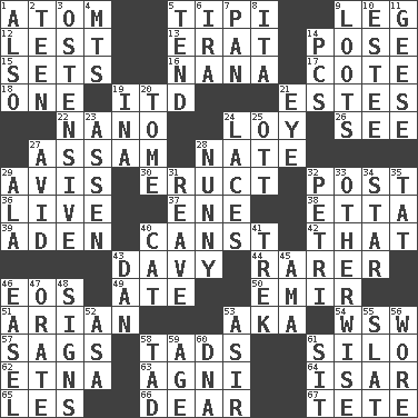 ACROSS 1. Smallest unit of an element 5. Native american tent (variation) 9. Part of a journey 12. For fear that 13. Part of Q.E.F. 14. Airs 15. Arranges properly for use 16. Nanny 17. ____ d'Azur (French Riviera) 18. Single 19. It would 21. _____ Park, CO 22. Billionth: prefix 24. Myrna of the movies 26. Observe 27. Indian state 28. Nathan's nickname 29. Advice 30. Spew [out] 32. Mail 36. Not recorded 37. Compass dir. 38. Singer James 39. An important port of Yemen 40. 2nd pers. sing. pres. of can (arch.) 42. Not this but _ 43. American folk hero Crockett 44. Less widely known 46. Greek goddess of the dawn 49. Had dinner 50. Arab leader 51. Believer in; advocate of (suffix) 53. Alias (abbr.) 54. Compass dir. 57. Sinks 58. Small boys 61. Grain storage tower 62. Inactive volcano in Sicily 63. Hindu god of fire 64. Austrian river, tributary to the Danube 65. French article 66. Letter starter 67. False hair DOWN 1. In addition 2. Adolescent 3. Clearly or manifestly demonstrative 4. Mountains (abbr.) 5. Look after 6. Retirement account (abbr.) 7. Baking dish 8. Call ___ day 9. Plunders 10. First name in cosmetics 11. Honkers 14. Personal Computers (abbr.) 19. _ tizzy (2 wds.) 20. Heavy book 21. Sight organ 23. NE Netherlands city 24. Shoestrings 25. Baseball player Mel 27. Enthusiastic 28. Pet term 29. Chicken ___ king 31. Rob, plunder, or pillage 32. _ dish (used to culture cells) 33. Else 34. Play the lead 35. Make lace 40. Feline 41. Long journey 43. One of the 12 tribes of Israel 45. Nursemaid (var.) 46. Artist's stand 47. Speak pompously 48. Signals 52. White ___ sheet 53. SW Saudi Arabia district 55. Narrow board 56. Had on 58. Small boy 59. Ripen 60. Heredity factor (abbr.) 61. Be seated