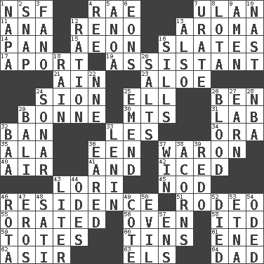 ACROSS 1. Overdraft (abbr.) 4. Actress Charlotte 7. Uhlan (variant) 11. Santa ___, CA 12. Former U.S. Attorney General Janet 13. Odor 14. Baking dish 15. Period of immesurable duration 16. Chalkboards 17. To the left, to Queeg 19. Helper 21. The 18th letter of the Arabic alphabet 23. Medicinal plant 24. The Jewish people; Israel 25. Pipe bend 26. Benjamin's nick name 29. Maid-servant 30. Mountains (abbr.) 31. Experiment locale 32. Forbid 33. French article 34. Mouth or opening 35. According to 36. Car or cant ending 37. Make _____ (do battle with) 40. Wind 41. Plus 42. On the rocks 43. Australian parrot (variant) 45. Lower and raise head in agreement 46. Dwelling 51. Cowboy competition 55. Spoke pompously 56. Baking chamber 58. It would 59. Hauls 60. Canisters 61. Compass dir. 62. SW Saudi Arabia district 63. Raised railways 64. Male parent DOWN 1. California wine valley 2. Fastener 3. Papal veil 4. Portuguese money of account (variant) 5. Small Philippine buffalo 6. Immeasurably long periods of time 7. A salt of uric acid 8. Globular water bottle used in Asia 9. So be it 10. Political cartoonist Thomas 12. Food allowance for one day 13. In addition 16. Beverly of Met fame 18. Precipitation 20. Table seasonings 22. Compass dir. 24. Underwater navigation system 25. Make improvements or corrections to 26. Vital fluid 27. Merit 28. Basketball assoc. 29. Indonesian resort city 32. Sound made by sheep 33. Soviet premier 1918-24 36. Having ears or earlike features 37. Acquire through effort 38. Oak nuts 39. Redecorate 43. 61 cubic inches 44. Lyric poems 46. Roll call or roster of names 47. Greek god of love 48. Suttee (variant) 49. ____ d'Azur (French Riviera) 50. Morally bad or wrong 52. Passed on 53. Inactive volcano in Sicily 54. Wrote a lyric poem 57. Followers of ems
