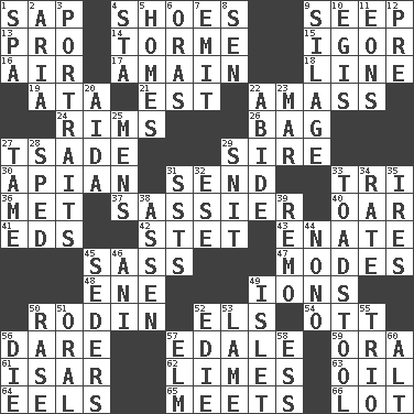 ACROSS 1. Plant excrement 4. Imelda's hoard 9. Ooze 13. Adept person 14. Singer Mel 15. Composer Stravinsky 16. Wind 17. With great haste 18. Actor's bit 19. "One Day ___ Time" 21. Eastern Standard Time (abbr.) 22. Collect or gather 24. Basketball hoops 26. Container for groceries 27. Sadhe (variant) 29. The founder of a family 30. Bee-related 31. Transmit 33. Three (prefix) 36. Was introduced to 37. More lively and spirited 40. Rowing implement 41. Begley and Asner 42. Proofreading order 43. Maternal 45. Backtalk 47. Methods 48. Compass dir. 49. Charged atoms 50. "The Thinker" sculptor 52. Raised railways 54. Baseball player Mel 56. Have the gumption 57. Peak District village in England 59. Mouth or opening 61. Austrian river, tributary to the Danube 62. Citrus fruits 63. Lubricate 64. Snakelike fish 65. Confronts 66. Car dealer's back yard DOWN 1. Health resort 2. Roberta Peters solo 3. Likenesses of persons 4. R.R. building 5. Residences 6. Mouths or openings 7. Send forth 8. Elected rep. 9. Fodder prepared in a silo 10. Armor plate that protects the chest 11. Immeasurably long periods of time 12. Before (prefix) 20. Opera by Verdi 22. Stay 23. Impair 25. Not women's 27. Not wild 28. Drove too fast 29. In a ____ (agitated or irritated) 31. Fast planes 32. Compass dir. 33. Inedible or poisonous agaric 34. Assign a rank or rating to 35. Angers 38. NE Netherlands city 39. San ____ (Riviera town) 44. Words to Nanette 45. Spring feasts 46. Black tropical American cuckoo 49. Small island 50. Raze (variant) 51. Spoken 52. Singer Brickell 53. Unable to walk 55. Musical group of three 56. Expire 57. Shade tree 58. Double-curved letter 60. The first octave above the treble staff