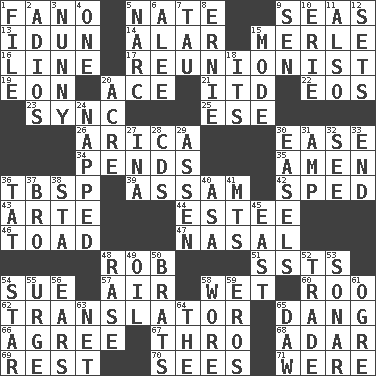 ACROSS 1. Papal veil 5. Nathan's nickname 9. Oceans 13. Goddess of spring and wife of Bragi 14. Having or resembling wings 15. Haggard of country music 16. Actor's bit 17. One who advocates reunion 19. Age 20. Adept person 21. It would 22. Greek goddess of the dawn 23. Synchronize (abbr.) 25. Compass dir. 26. N. Chile seaport 30. Relaxation 34. Hangs 35. So be it 36. Cook's measure (abbr.) 39. Indian state 42. Drove too fast 43. Johnson of "Laugh-In" 44. First name in cosmetics 46. Frog relative 47. Rhinal 48. Director Reiner 51. Fast planes 54. Institute legal proceedings 57. Atmosphere 58. Soggy 60. Friend of Pooh 62. Interpreter 65. Mild oath, euphamism for damn 66. Match 67. Through, poetically 68. The sixth month of the Jewish calendar 69. State of inaction 70. Perceives with the eye 71. Past tense of be (plural) DOWN 1. Do some clerical work 2. Goodbye (Sp.) 3. Pet term 4. Single 5. Drug cop 6. Toward shelter 7. The 19th letter of the Greek alphabet 8. Bert's buddy 9. Elected rep. 10. One of the Great Lakes 11. In addition 12. Arranges properly for use 15. Method 18. ___ a Wonderful Life 20. 43,560 square feet 24. Slept 27. _ tizzy (2 wds.) 28. Music discs 29. NE Netherlands city 30. Artist's stands 31. Electrical Unit 32. Observe 33. Conclusion 36. Make lace 37. Sis' sibling 38. R.R. building 40. White ___ sheet 41. Mountains (abbr.) 45. 90 degrees 48. To erase 49. Lubricate 50. Naughty children 52. Barter 53. Echolocation 54. Play the lead 55. Goad 56. Hearing organs 58. Had on 59. Greek god of love 61. Legendary monster 63. Fish or hair follower 64. Definite Article 65. Fool