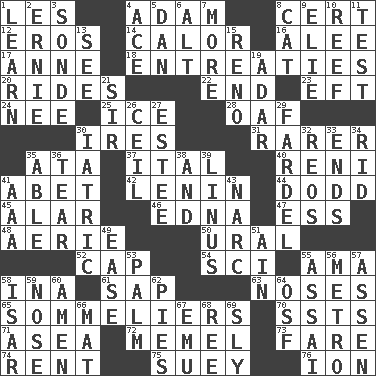 ACROSS 1. French article 4. First of billions? 8. Foregone conclusion 12. Greek god of love 14. Bodily heat indicating an inflammation 16. Toward shelter 17. Singer Murray 18. Pleas 20. Amusement-park features 22. Conclude 23. Lizard (obsolete) 24. Born 25. Frozen water 28. Clumsy lout 30. Angers 31. Less widely known 35. _ moment's notice (2 wds.) 37. Slanted text style (abbr.) 40. Painter Guido (1575-1642) 41. Collude with 42. Soviet premier 1918-24 44. Texas town _ City 45. Having or resembling wings 46. Pulitzer Prize-winning author Ferber 47. Double-curved letter 48. Nest on high 50. Mountain range 52. Head covering 54. _-fi 55. Wet nurse (var.) 58. _ tizzy (2 wds.) 61. Plant excrement 63. Olfactory organs 65. Wine waiters 70. Fast planes 71. At sea 72. Klaipeda city 73. Conductor's collection 74. Monthly bill 75. Chop _ 76. Electrically charged atom DOWN 1. Acquire or gain knowledge or skills 2. Bert's buddy 3. Message 4. Adept person 5. One of the 12 tribes of Israel 6. Keyboard modifier key 7. Greater amount 8. Domesticated feline 9. Writer Wiesel 10. Coral collection 11. Trial 13. Observe 15. Former U.S. Attorney General Janet 19. The sixth month of the Jewish calendar 21. Title for a knight 26. To provide with a ceiling 27. First name in cosmetics 29. Pack 30. Of or pertaining to medicine 32. Vintage cars 33. Conclusions 34. To free from 35. Competent 36. Pull apart 38. Also 39. "_ and Lucy" (Charlie Brown theme song) 41. Auto club (abbr.) 43. Drug cop 49. Relaxation 51. The 18th letter of the Arabic alphabet 53. Inside of hand 55. Slender Brazilian palm 56. Paris' subway 57. NE Netherlands city 58. Austrian river, tributary to the Danube 59. Olfactory organ 60. So be it 62. Sliced desserts 64. Order of Saint Francis (abbr.) 66. Floor covering 67. Australian flightless bird 68. To separate or throw off 69. Stealthy
