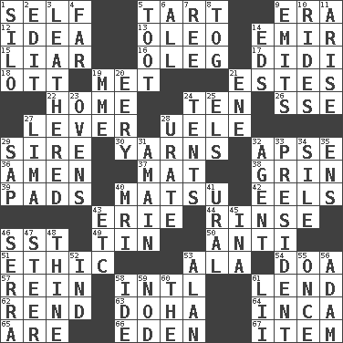 ACROSS 1. Automatic 5. Small pie 9. Epoch 12. The main thing one is thinking about 13. Margarine 14. Arab leader 15. One who doesn't tell the truth 16. Cassini of fashion 17. "You Light Up My Life" star Conn 18. Baseball player Mel 19. Was introduced to 21. _____ Park, CO 22. Residence 24. Nine, plus one 26. Compass dir. 27. Prying instrument 28. Ubangi River tributary 29. Father 30. Tall tales 32. Domed church section 36. So be it 37. Floor protector 38. Broad smile 39. Groovy apts. 40. Taiwanese island in East China Sea 42. Snakelike fish 43. One of the Great Lakes 44. Wash lightly 46. Fast jet (abbr.) 49. Metal container 50. Opposed to 51. Moral principle 53. Insect wing 54. ___ good deed 57. It's straight from the horse's mouth 58. International (abbr.) 61. Grant temporary use of 62. Tear apart 63. Capital of the state of Qatar 64. South American Indian 65. "We ___ not amused" (Victoria) 66. Paradise 67. A whole individual unit DOWN 1. Grain storage tower 2. Prepare for publication 3. Tough but pliablecoriaceous 4. Distant 5. A blast of a horn 6. Everything 7. To riddle 8. Coat; cloak 9. Sends forth 10. Amusement-park features 11. Get up 14. Begley and Asner 19. Madame (abbr.) 20. Suggestive of the supernatural 21. Compass dir. 23. Baking chambers 24. Portable shelters 25. Raised railways 27. Pale green bean 28. A salt of uric acid 29. Plant excrement 31. At full speed 32. Rep 33. Elected leader of a country 34. Drop; flow; fall 35. Followers of ems 40. Medical imaging device (abbr.) 41. Mountain range 43. And so on (abbr.) 45. _ tizzy (2 wds.) 46. Father Junipero _ 47. Navigate 48. One or ones belonging to thee 52. Indiana (abbr.) 53. Actor Alda or Thicke 55. Single time 56. First of billions? 58. Binary compound 59. Allow head to fall sleepily 60. Definite Article 61. Cards in a Roman deck?