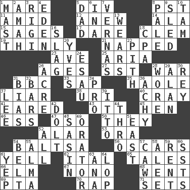 ACROSS 1. Female horse 5. HTML Container Element 8. Pacific Standard Time (abbr.) 11. Among 12. Afresh 14. Chicken ___ king 15. Gurus 17. Have the gumption 18. To starve (Brit.) 19. Without thickness 21. Slept 23. "___ Maria" 25. Operatic vocal solo 26. Eras 27. Fast jet (abbr.) 28. Armed conflict 31. English channel? 33. Plant excrement 35. White Person, in Hawaii 37. One who doesn't tell the truth 38. RI univ. 40. Supercomputer manufacturer 41. Having ears or earlike features 43. Baseball player Mel 45. Layer 46. Curvy letter 47. Bear (Spanish) 50. Those people 52. Having or resembling wings 53. Mouth or opening 54. Greek mezzo-soprano Agnes 56. Motion picture awards 61. Shout 62. Slanted text style (abbr.) 65. Falsehoods 66. Shade tree 67. Words to Nanette 68. Left 69. Parent Teacher Association (abbr.) 70. Reproach for some lapse or misdeed 71. Arranges properly for use DOWN 1. Vertical spar for supporting sails 2. Wet nurse 3. Swiss mountan, "Queen of the Mountains" 4. Genesis locale 5. June honoree 6. _ tizzy (2 wds.) 7. Actresses Bloom and Felton 8. Diluted with white 9. Downhill vehicle 10. Scottish cap 13. Erodes 16. Volcanic refuse 18. Numbers guy (abbr.) 20. Jacques Cousteau's middle name 22. Heart or essence 24. He sold his birthright 26. Measure of real estate 28. Had on 29. ____ Jay Lerner 30. Marina Del _, California 31. Prejudice 32. Oblong pieces of solid material 34. Adept person 36. Painful 37. Area sheltered from the wind 39. "Tell ____ the Marines!" 42. Dunce 44. Through, poetically 48. Indian antelope 49. Speaker 51. Compass direction 52. Everything 54. Waist strap 55. _ mater 57. Crow sounds 58. Toward shelter 59. Monthly bill 60. Fast planes 61. Slangy assent 63. Santa ___, CA 64. Trim (branches)
