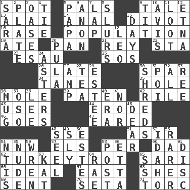 ACROSS 1. Blemish 5. Friends 9. Falsehood 13. Mountain range southwest of Kyrgyzstan 14. Of or related to the anus 15. A piece of turf (Scot.) 16. To erase 17. Census information 19. Had dinner 20. Baking dish 21. Marina Del _, California 22. R.R. building 23. He sold his birthright 25. Distress signal 26. Chalkboard 30. Practice fight 34. Domesticates 35. Opening into or through something 36. Undercover agent 39. Eucharist need 42. Cause heat under the collar 43. One who uses or employs something 44. Wear away 46. Leaves 47. Having ears or earlike features 48. Compass dir. 51. SW Saudi Arabia district 54. Compass dir. 57. Raised railways 58. For each 60. June honoree 62. Ragtime dance 65. Indian skirt 66. Perfect 67. 90 degrees 68. "______ My Girl" (Turtles hit) 69. Transmitted 70. Bristle 71. Torque (variant) DOWN 1. "Two Mules for Sister ____" 2. Food holder 3. Fertile tracts in a desert 4. Standoff 5. Dad 6. At once, immediately (arch.) 7. Infant locale 8. Runs notes together 9. Teat (slang) 10. Advice 11. Spoils 12. Inactive volcano in Sicily 15. 24-hour periods 18. Lion 20. Monetary unit of Botswana 24. Michaelmas daisies 27. Electrical Unit 28. Beverage made from leaves 29. First name in cosmetics 30. Tears up 31. Luau course 32. Everything 33. To sift 36. Java container 37. Bear (Spanish) 38. Area sheltered from the wind 40. Period 41. Not either 45. Letter starter 48. Stitch closed the eyes of (a falcon) 49. Mischievous 50. _____ Park, CO 52. Potato state 53. Less widely known 54. Nuclear Threat Initiatives 55. Unadorned 56. Songbird 58. Mail 59. Singer James 61. Flat circle 63. Krazy ___ of comics 64. Actress Charlotte 65. Fast jet (abbr.)