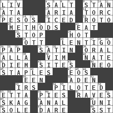 ACROSS 1. 54 in ancient Rome 4. Table seasoning 8. Comedian Laurel of Laurel & Hardy 12. "One Day ___ Time" 13. Operatic vocal solo 14. Torque (variant) 15. Mexican monetary units 18. On the rocks 19. Printing process, for short 20. Modes 22. Erode 23. Close up, plug up 24. Being at a high temperature 25. Baseball player Mel 26. Small, flat, pigmented spot on the skin 30. Infant food 33. Smooth fabric 36. Taken by mouth 37. Silent film actress Nazimova 39. Zeal 40. Nathan's nickname 41. South Vietnam president (1954) 42. Settings 44. Modern: prefix 45. Paper fasteners 47. Greek goddess of the dawn 50. Car or cant ending 51. An important port of Yemen 53. Big collection agency 54. Manned the helm 57. Singer James 59. Sliced desserts 61. All-night dance parties 63. Heroin 64. Of or related to the anus 65. Single; one (prefix) 66. Flatfish 67. Have the gumption 68. Fast jet (abbr.) DOWN 1. Pet locale 2. A whole individual unit 3. Flower holders 4. Expressed in words 5. Curves 6. Untruth 7. Small amount or degree 8. Ski resort town in Vermont 9. A blast of a horn 10. Tate display 11. Non-commissioned officer (abbr.) 16. "Beetle Bailey" pooch 17. Attempt 21. Elects 22. Period of immesurable duration 24. Layer 26. Welles in "The Third Man" 27. SW Asia republic 28. Yard entry 29. Butter sub 30. Groovy apts. 31. Set down 32. Entreaty 34. Advice 35. Teat (slang) 38. Electrical Measurement 42. Elected rep. 43. Lick closed 46. French article 48. Scent 49. Bristle 52. Mole, birthmark 53. Slanted text style (abbr.) 54. Lightbulb-shaped fruit 55. Small island 56. Hiding places for outlaws 57. Curvy letter 58. Ring climax 59. Groovy apt. 60. _ tizzy (2 wds.) 62. Be seated