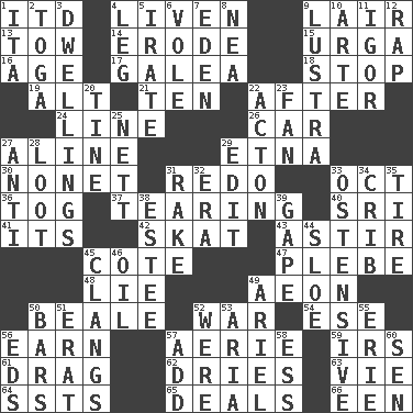 ACROSS 1. It would 4. Make or become more lively 9. Den 13. Pull behind 14. Eat (away) 15. Capital and largest city of Mongolia 16. Ripen 17. An organ shaped like a helmet 18. Discontinue 19. Keyboard modifier key 21. Nine, plus one 22. Following 24. Actor's bit 26. Auto 27. Place in a line 29. Inactive volcano in Sicily 30. Music written for nine 31. Do over again 33. Sep. follower 36. Coat; cloak 37. Pulling apart 40. _ Lanka 41. It is 42. Three-handed card game 43. Moving about 45. ____ d'Azur (French Riviera) 47. Military trainee 48. Falsehood 49. Age 50. Memphis, Tenn. Street 52. Armed conflict 54. Compass dir. 56. Merit 57. Nest on high 59. Big collection agency 61. To trail on the ground 62. Frees from moisture 63. Compete 64. Fast planes 65. Allots cards 66. Car or cant ending DOWN 1. Call ___ day 2. Ancient Roman robe 3. Homes 4. Part of a journey 5. Feeling or showing extreme anger 6. Short-tailed, large-bodied rat 7. Locale of original sin 8. Teachers' org. 9. A period of five years 10. Johnson of "Laugh-In" 11. Russian composer Stravinsky 12. Strike 20. Prong on a fork 22. Gambison 23. Air blower 25. Remaining after all deductions 27. Opposed to 28. Spoils 29. Prepare for publication 31. Libertine 32. Period 33. Clearly or manifestly demonstrative 34. Baby bed with high sides 35. Hoop that covers a wheel 38. First name in cosmetics 39. Yawn 44. A type of plum 45. Gives out a loud, resonant sound 46. Petroleum 49. Satellite of Uranus 50. Oblong pieces of solid material 51. Part of Q.E.F. 52. Past tense of be (plural) 53. Operatic vocal solo 55. One of the Great Lakes 56. Begley and Asner 57. Find the sum of 58. Curvy letter 60. Elected rep.
