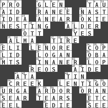 ACROSS 1. Adept person 4. Small, secluded valley 8. The 19th letter of the Greek alphabet 11. Assist 12. The wife of a rajah (variant) 14. Political cartoonist Thomas 15. It may be bright or harebrained 17. Approach 18. Migrant worker of the '30s 19. Snuggling 21. Tree or shrub in the Birch family 23. Baseball player Mel 24. It is so 25. _ mater 27. Hoop that covers a wheel 30. Connecticut Ivy Leaguer 31. Poe poem 34. Police officer (slang) 37. Flaplike covering 38. Utah city north of Ogden 39. Chief or king in Benin or Nigeria 40. Mountains (abbr.) 41. More lacking in sense or substance 43. Trim (branches) 44. Vintage cars 45. Assistant 47. "One Day ___ Time" 49. Metal container 50. Small stream 52. Small, flat, pigmented spot on the skin 56. Capital and largest city of Mongolia 57. Zeal 60. Northwest Algerian city 61. Dry up 62. Pulls apart 63. And so on (abbr.) 64. Snakelike fish 65. Singer Brickell 66. Observe DOWN 1. Ache 2. Travel on an animal 3. Lyric poems 4. Monetary aid 5. Austrian-born American filmmaker Fritz 6. Compass dir. 7. Teachers' org. 8. Receives possession of 9. SW Saudi Arabia district 10. Shoshoni 13. Epoch 14. Thickened enlargement 16. Tiny particle 20. Slanted text style (abbr.) 22. Sodium hydroxide 25. Came down and settled, as after flight 26. Hats (slang) 27. Ancient Roman robes 28. SW Asia republic 29. French philosopher Descartes 30. Shade tree 32. Writer Wiesel 33. Words to Nanette 34. Having a low temperature 35. Mitch Miller's instrument 36. Infant food 42. Precipitation 44. Actress Charlotte 46. To the inside or interior of 47. Therefore, facetiously 48. Pull apart 49. Laconic 50. Algonquian 51. Krazy ___ of comics 52. Australian parrot (variant) 53. Angers 54. Yard entry 55. Single time 56. Purpose 58. Portuguese money of account (variant) 59. Male parent