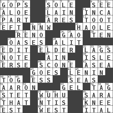 ACROSS 1. Republicans 5. Not divided or shared with others 9. Observe 12. Medicinal plant 13. (Had) reclined 14. South American Indian 15. Component 16. Ancient Greek god of war 17. A blast of a horn 18. Newt 19. Compass dir. 21. White Person, in Hawaii 22. Western Nevada city 24. E Mali city 26. "___ Little Indians" 27. Fertile tracts in a desert 28. Came down and settled, as after flight 29. Prepare for publication 30. A person who is older than you are 32. Straggles 36. Brief written record 37. The 18th letter of the Arabic alphabet 38. Capri or Wight 39. Celtic language 40. Biscuitlike quick bread 42. Toward the sea 43. Leaves 44. Soviet premier 1918-24 46. Coat; cloak 49. Double-curved letter 50. Oceans 51. Composer Copland 53. Set 54. Label 57. Proofreading order 58. Chinese city south-southwest of Nanjing 61. "Two Mules for Sister ____" 62. Not this but _ 63. Nuclear Threat Initiatives 64. Leg joint 65. Eastern Standard Time (abbr.) 66. 270 degrees 67. Slanted text style (abbr.) DOWN 1. Stare wonderingly 2. Norwegian king 3. Likenesses of persons 4. Put into a specified state 5. Cole _ (cabbage dish) 6. Boat paddle 7. Untruth 8. Followers of ems 9. Snob 10. Learning spot: Fr. 11. Eroded 14. Call ___ day 19. Compass dir. 20. Sense of smell 21. Being at a high temperature 23. First name in cosmetics 24. American astronaut and politician John 25. Atmosphere 27. Scent 28. Goodbye (Sp.) 29. Compass dir. 31. Shoestrings 32. Woody, climbing, usually tropical plant 33. Aide 34. Small, secluded valley 35. Ocean 40. Distress signal 41. Otherwise 43. Commissioned mil. rank 45. Snakelike fish 46. Clothes sense 47. Curses 48. Relatively large 52. Baseball player Mel 53. Abrupt rush of wind 55. Type of rug 56. Highlander 58. Compass dir. 59. Shoshoni 60. Part of HMS, perhaps 61. What Jean-Claude Killy likes to do