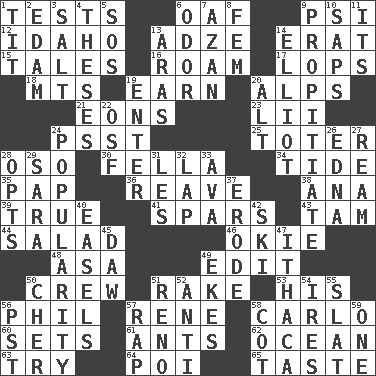 ACROSS 1. Trials 6. Clumsy lout 9. 23rd letter of the Greek alphabet 12. Potato state 13. Axlike tool, used for shaping wood 14. Part of Q.E.F. 15. Falsehoods 16. Wander aimlessly 17. Chops off 18. Mountains (abbr.) 19. Merit 20. High mountains 21. Immeasurably long periods of time 23. Cards in a Roman deck? 24. Inconspicuous attention getter 25. Carrier 28. Bear (Spanish) 30. Chap (slang) 34. Event that recurs at intervals 35. Infant food 36. Rob, plunder, or pillage 38. Santa ___, CA 39. Loyal 41. Practice fights 43. Scottish cap 44. Vegetable dish 46. Migrant worker of the '30s 48. White ___ sheet 49. Prepare for publication 50. Group working together 51. Libertine 53. Part of HMS, perhaps 56. Silvers or Donahue 57. French philosopher Descartes 58. Monte _, Las Vegas Hotel/Casino 60. Puts into a specified state 61. Pismires 62. Sea 63. Attempt to accomplish something 64. Luau course 65. Clothes sense DOWN 1. Teat (slang) 2. Dutch treat 3. Table seasoning 4. College papers 5. Mayday 6. Aroma 7. Muslim summons to prayer 8. Opposite of masc. 9. Conciliate 10. Plant excrements 11. It is 13. Caspian sea tributary 14. American author Paul (1891-1958) 19. Keyboard key 20. Keyboard modifier key 22. Order of Saint Francis (abbr.) 24. Teen's desire 26. Pulitzer Prize-winning author Ferber 27. 480, 500 or 516 sheets of paper 28. Chooses 29. "Two Mules for Sister ____" 31. French article 32. Pet locale 33. Actress Gardner 37. Wear away 40. Artist's stands 42. What Jean-Claude Killy likes to do 45. Simpleton 47. New York city 49. Makes supply last 50. "Mermaids" star 51. Western Nevada city 52. Opposed to 54. Angers 55. Narrow board 56. Pacific Standard Time (abbr.) 57. Reproach for some lapse or misdeed 58. Small bed 59. Single