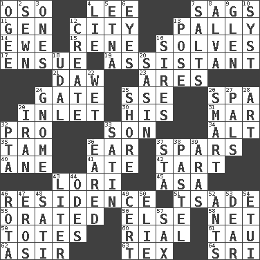 ACROSS 1. Bear (Spanish) 4. Area sheltered from the wind 7. Sinks 11. Commissioned military rank (abbr.) 12. Municipality 13. Chummy 14. She-sheep 15. French philosopher Descartes 16. Finds the solution 17. Follow as a consequence or result 19. Helper 21. Obsolete 23. Ancient Greek god of war 24. Yard entry 25. Compass dir. 26. Health resort 29. An arm off of a larger body of water 30. Part of HMS, perhaps 31. Impair 32. Adept person 33. Male child 34. Keyboard modifier key 35. Scottish cap 36. Hearing organ 37. Practice fights 40. One (Scot) 41. Had dinner 42. Small pie 43. Australian parrot (variant) 45. White ___ sheet 46. Dwelling 51. Sadhe (variant) 55. Spoke pompously 56. Otherwise 58. Fish or hair follower 59. Hauls 60. Monetary unit of Yemen 61. The 19th letter of the Greek alphabet 62. SW Saudi Arabia district 63. John Ritter's dad 64. Indian title of respect (Mr.) DOWN 1. Double curve, resembling the letter S 2. Stitched 3. Washington bills 4. Falsehood 5. Inactive volcano in Sicily 6. Snake ____ (dice throw) 7. Table seasonings 8. Inventor's middle name 9. Small, secluded valley 10. System (abbr.) 12. Make 13. Introduce or present, as a question 16. Founders of families 18. Freehold land 20. Indian antelope 22. Soggy 24. Dwarf 25. Dinah or Pauly 26. Don Adams' spy role 27. Friends 28. Tate display 29. SW Asia republic 32. Parent Teacher Assoc. 33. Smooth fabric 36. Having ears or earlike features 37. R.R. building 38. Soft color 39. Caspian sea tributary 43. 61 cubic inches 44. Lyric poems 46. Roll call or roster of names 47. Greek god of love 48. Suttee (variant) 49. An absolute certainty 50. Writer Wiesel 52. Pismires 53. Letter starter 54. Needle holder 57. Saxophone