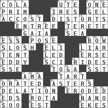 ACROSS 1. Root beer relative 5. Shoshoni 8. Single 11. Demure 12. Angers 13. Set 14. Buttonhole 17. What propaganda does 19. Main course 21. Cigar-shaped 22. Greek goddess of the earth (variant) 23. Ocean 24. Double-curved letter 27. Airs 29. Ribbon knot 32. Make a splashing sound 34. Biblical high priest 36. One who doesn't tell the truth 37. Portable shelter 38. Directed 39. Celtic language 40. Whirlpool 41. _-fi 42. Amusement-park features 43. Compass dir. 44. Ancient Roman robe 46. Fast jet (abbr.) 47. Wet nurse (var.) 50. Small pie 52. Spoke pompously 55. Michaelmas daisies 57. Accusation by an informer 59. Worn away 62. Begley and Asner 63. Roll call or roster of names 64. Billionth: prefix 65. "Barney Miller" actor Jack 66. Eastern Standard Time (abbr.) 67. Makes supply last DOWN 1. Numbers guy (abbr.) 2. The grampus (Milton) 3. Louse (plural) 4. Amid 5. RI univ. 6. Trials 7. First name in cosmetics 8. Legendary monster 9. Remaining after all deductions 10. Otherwise 12. Binary compound 15. Staphylococcus 16. Musical group of three 18. Mouth or opening 20. Artist's stands 24. _____ Park, CO 25. Bobsleighs 26. Message 28. Choose 29. Avian creatures 30. Fertile tracts in a desert 31. Obtain by seizing forcibly or violently 33. Filthy place 35. Foolish or stupid persons 36. Flowery wreath 42. More valued for its uncommonness 45. Yard entry 47. "One Day ___ Time" 48. Distance measurement (Brit.) 49. Goodbye (Sp.) 51. Heavy duty weighing machine 52. Lyric poems 53. Do over again 54. In addition 55. Santa ___, CA 56. Neighbor of Neb. 58. Baseball player Mel 60. Compass dir. 61. Two (Sp.)