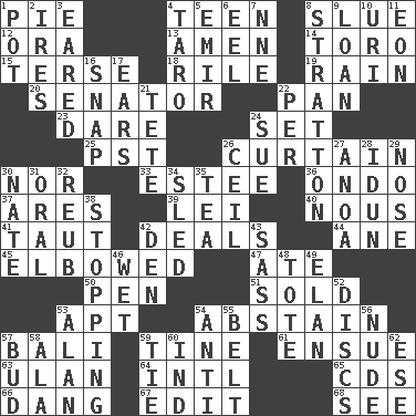 ACROSS 1. Sliced dessert 4. Adolescent 8. Turn sharply 12. Mouth or opening 13. So be it 14. "Corrida" creature 15. Laconic 18. Cause heat under the collar 19. Precipitation 20. Elected representative 22. Baking dish 23. Have the gumption 24. Arrange properly for use 25. Pacific Standard Time (abbr.) 26. Window treatment 30. Or not 33. First name in cosmetics 36. Southwest Nigerian state 37. Ancient Greek god of war 39. Luau accessory 40. Horse sense 41. Strained 42. Allots cards 44. One (Scot) 45. Turned at an angle; bent 47. Had dinner 50. Fenced enclosure 51. Disposed of to a purchaser 53. Fitting 54. Choose not to consume 57. Indonesian resort city 59. Prong on a fork 61. Follow as a consequence or result 63. ____ Bator 64. International (abbr.) 65. Music discs 66. Mild oath, euphamism for damn 67. Prepare for publication 68. Observe DOWN 1. Plant holder 2. Angers 3. Having ears or earlike features 4. Edible starchy tuberous root 5. Independent ruler or chieftain 6. Snakelike fish 7. Compass dir. 8. Ski resort town in Vermont 9. Grant temporary use of 10. RI univ. 11. A really long time 16. Fastener 17. Hearing organs 21. Wig 22. For each 24. Institute legal proceedings 26. To provide with a ceiling 27. Small Philippine buffalo 28. Goddess of spring and wife of Bragi 29. Sense of smell 30. Nathan's nickname 31. Relating to the mouth 32. Reuben's nickname 34. Downhill vehicle 35. Afternoon social gathering 38. Closing up, plugging up 42. Lair 43. Backtalk 46. Soggy 48. Carryall 49. Enthusiasm 52. Plates 53. Actor Alda or Thicke 54. Against 55. Waist strap 56. Naked 57. Partially opened flower 58. In the manner of 59. Standoff 60. Working for oneself (abbr.) 62. Compass dir.
