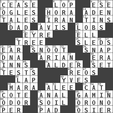 ACROSS 1. Stop 6. Trim (branches) 9. Compass dir. 12. Stares 13. Israeli folk dance 14. Arabian gulf 15. Stories 16. SW Asia republic 17. Metal containers 18. June honoree 19. Advice 20. Tennis shots 21. Jane of fiction 23. Pipe bend 24. Family _ (genealogy) 25. Bobsleighs 28. Ewer handle 30. Snob 34. Fastener 35. Heredity factor (abbr.) 36. Believer in; advocate of (suffix) 38. Period 39. Lodging establishments 41. Tree or shrub in the Birch family 43. Put into a specified state 44. Trials 46. Vintage cars 48. Pet locale 49. Jacques Cousteau's middle name 50. Hindu Mythology: god of death 51. Toward shelter 53. Domesticated feline 56. ____ d'Azur (French Riviera) 57. Of or related to the anus 58. Homeless child 60. Aroma 61. Land 62. U. of Maine site 63. For each 64. Groovy apt. 65. Flexible twig of a willow tree DOWN 1. Small bed 2. Mild oath 3. Silent film actress Nazimova 4. Sowing specialist 5. Curvy letter 6. Australian parrot (variant) 7. Mouths or openings 8. Baking dish 9. The property of being fit to eat 10. Elected reps. 11. Followers of ems 13. Hub of activity 14. Ringlike coral islands and reefs 19. Sports stadium 20. French article 22. Consenting reply 24. Interpreter 26. Have the gumption 27. Petty quarrel 28. Prepare for publication 29. Singer Murray 31. Mouth or opening 32. Petroleum 33. Small boy 37. Impudent aggressiveness 40. A viewer who gazes fixedly 42. Portuguese money of account (variant) 45. Health resort 47. Motion picture awards 49. Shout 50. Method 51. Small Philippine buffalo 52. Put down 54. Mine, in Marseilles 55. Prong on a fork 56. Police officer (slang) 57. Cleo's killer 58. Thick or sticky substance 59. Not either