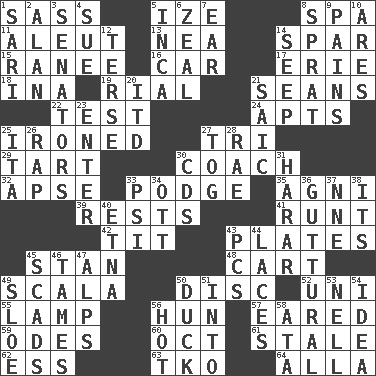 ACROSS 1. Backtalk 5. Ending with capital 8. Health resort 11. Eskimo relative 13. Teachers' org. 14. Coast Guard woman 15. The wife of a rajah (variant) 16. Auto 17. 4th largest of the Great Lakes 18. _ tizzy (2 wds.) 19. Monetary unit of Yemen 21. Actors Connery and Penn 22. Trial 24. Flats, for short 25. Pressed 27. Three (prefix) 29. Small pie 30. Team commander 32. Domed church section 33. Porridge 35. Hindu god of fire 39. Musical pauses 41. The smallest animal of a litter 42. Teat (slang) 43. Food holders 45. Comedian Laurel of Laurel & Hardy 48. Heavy open wagon 49. Any of the three canals of the cochlea 50. Plate 52. Single; one (prefix) 55. Desk light 56. Attila the _ 57. Having ears or earlike features 59. Lyric poems 60. Sep. follower 61. Showing deterioration from age 62. Curvy letter 63. Ring climax 64. Silent film actress Nazimova DOWN 1. Indian skirt 2. ____ Jay Lerner 3. Elected representatives 4. Take to court 5. South American Indian 6. Ardor 7. Hearing organ 8. Small fatty European fish 9. Aches 10. Ancient Greek god of war 12. Laconic 14. Ooze 20. It would 21. Ketch in the Levant 23. Keyboard key 25. Call ___ day 26. Hit sharply and swiftly 27. Coat; cloak 28. Actress Charlotte 30. Music discs 31. Ethiopian city, capital of Harari 33. 23rd letter of the Greek alphabet 34. Baseball player Mel 36. From the throat 37. Compass dir. 38. It is 40. Inactive volcano in Sicily 43. Personal Computers (abbr.) 44. Shoestrings 45. Oodles 46. Corrects by punishment or discipline 47. High mountains 49. _ gin 50. Evade 51. To the inside or interior of 53. 1994 drama film starring Jodie Foster 54. The content of cognition 56. Being at a high temperature 58. _ moment's notice (2 wds.)