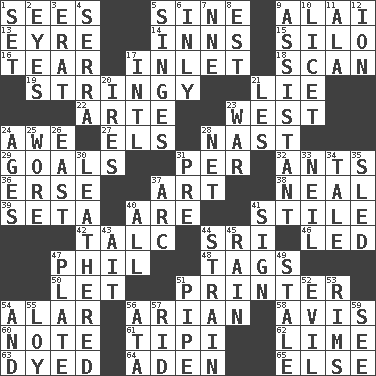 ACROSS 1. Observes 5. Trig term 9. Jai ____ 13. Jane of fiction 14. Restaurants 15. Grain storage tower 16. Rend 17. An arm off of a larger body of water 18. Examine hastily 19. Slender, wiry 21. Falsehood 22. Johnson of "Laugh-In" 23. Compass direction 24. Deep reverence 27. Raised railways 28. Political cartoonist Thomas 29. Scores awarded for successful feats 31. For each 32. Pismires 36. Celtic language 37. Tate display 38. Actress Patricia 39. Bristle 40. "We ___ not amused" (Victoria) 41. Vertical member of a panel or frame 42. Baby powder 44. _ Lanka 46. Directed 47. Silvers or Donahue 48. Labels 50. Allow 51. Hard copy producer 54. Having or resembling wings 56. Believer in; advocate of (suffix) 58. Opinion 60. Make mention of 61. Native american tent (variation) 62. Welles in "The Third Man" 63. Colored 64. An important port of Yemen 65. Otherwise DOWN 1. Arrange properly for use 2. Sight organs 3. Part of Q.E.F. 4. Spanish missionary in California 5. Scorches 6. Inwardly 7. Compass dir. 8. Eastern Standard Time (abbr.) 9. Aide 10. It is permitted: Lat. 11. Chicken ___ king 12. Electrically charged atom 17. International (abbr.) 20. Angers 21. French article 23. Armed conflict 24. Ripens 25. Had on 26. Compass direction 28. Fish or hair follower 30. Resembling or made to resemble leather 31. Before (prefix) 33. Famous astronaut Armstrong 34. Falsehood 35. Downhill vehicle 37. Curve 40. Everything 41. Signal 43. Small island 44. Put through a sieve 45. Precipitation 47. Food holder 49. Having lost freshness 51. Corncob 52. Tending to cause great harm 53. Basketball hoops 54. Added to 55. Myrna of the movies 56. _ moment's notice (2 wds.) 57. To free from 59. Perceive with the eye