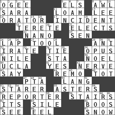 ACROSS 1. Double curve, resembling the letter S 5. Raised railways 8. Leather borer 11. "Two Mules for Sister ____" 12. Rich soil 13. Area sheltered from the wind 14. Speaker 17. Happening 19. Cylindrical with tapered ends 21. Chooses 22. Billionth: prefix 23. Elected rep. 24. Pet locale 27. Utensil 29. Black tropical American cuckoo 32. Feeling or showing extreme anger 34. Standoff 36. Musical composition 37. Mediterranean tributary 38. R.R. building 39. Christmas carol 40. Southern CA. univ. 41. Consenting reply 42. Impudent aggressiveness 43. Declare 44. San ____ (Riviera town) 46. Small child 47. Parent Teacher Assoc. 50. Austrian-born American filmmaker Fritz 52. A viewer who gazes fixedly 55. Michaelmas daisies 57. Newsperson 59. Flight of steps 62. ___ a Wonderful Life 63. Filth; sediment 64. Expressions of contempt or scorn 65. Perceive with the eye 66. Snakelike fish 67. Frozen precipitation DOWN 1. Bear (Spanish) 2. Slender fish 3. Part of Q.E.F. 4. Consumed 5. A really long time 6. Shoestrings 7. Grin 8. Actor Baldwin 9. Gone 10. Allows 12. Untruth 15. Speak pompously 16. Western Nevada city 18. Lair 20. A girl or young woman (variant) 24. "_ and Lucy" (Charlie Brown theme song) 25. N. Chile seaport 26. Friendly 28. 61 cubic inches 29. To the left, to Queeg 30. New (sp.) 31. Small island 33. Afternoon social gathering 35. Artist's stands 36. Single 42. Music written for nine 45. Floor protectors 47. Adept person 48. Laconic 49. Nick name for Arthur 51. Catches 52. Indian titles of respect 53. False hair 54. Domed church section 55. "We ___ not amused" (Victoria) 56. The Jewish people; Israel 58. Pipe bend 60. Friend of Pooh 61. Compass dir.