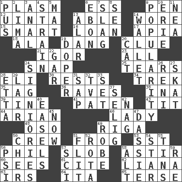ACROSS 1. Suffix with ecto or cyto 6. Curvy letter 9. Fenced enclosure 12. National forest in Provo, Utah 13. Competent 14. Had on 15. Don Adams' spy role 16. Grant temporary use of 17. Capital of Western Samoa 18. Wing 19. Mild oath, euphamism for damn 20. A slight indication 21. Russian composer Stravinsky 23. 100% 24. Fastener 25. Separates forcefully 28. Connecticut Ivy Leaguer 30. Musical pauses 34. Long journey 35. Label 36. All-night dance parties 38. _ tizzy (2 wds.) 39. Prong on a fork 41. Eucharist need 43. Teat (slang) 44. Believer in; advocate of (suffix) 46. Kenny Rogers chart-topper in '80 48. Bear (Spanish) 49. Port city in Latvia 50. Group working together 51. Toadlike animal 53. Fast jet (abbr.) 56. Silvers or Donahue 57. Oscar Madison type 58. Having gotten out of bed 60. Observes 61. Quote 62. Climbing, woody, usually tropical vines 63. Big collection agency 64. Call ___ day 65. Laconic DOWN 1. Festering 2. Pale green bean 3. Of or related to the anus 4. Put through a sieve 5. Floor covering 6. Inky black, to poets 7. Volcanic refuse 8. Elected rep. 9. Teen's desire 10. 4th largest of the Great Lakes 11. Teachers' org. 13. Having or resembling wings 14. Place for singles 19. Drug addict 20. Domesticated feline 22. Slender fish 24. Seigniories (variant) 26. Painter Guido (1575-1642) 27. Three-handed card game 28. Singer James 29. Den 31. Plant excrement 32. Federal power corp. 33. Put into a specified state 37. Former Milwaukee Brewers owner Bud 40. Artist's stands 42. Tired old horse 45. At this time 47. Hyrax 49. Loose flowing garment 50. "Mermaids" star 51. Sudden quick movement 52. Round or rotation of duties 54. Play the lead 55. Canisters 56. Air pressure measure (abbr.) 57. _-fi 58. Keyboard modifier key 59. Actress Charlotte