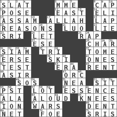 ACROSS 1. Narrow board 5. Madame (abbr.) 8. Head covering 11. Airs 12. 90 degrees 14. Biblical high priest 15. Indian state 17. Assad's deity 18. Infant locale 19. Thinks logically 21. Nilotic language 22. Falsehood 23. _ Lanka 24. Allow 25. Reproach for some lapse or misdeed 27. Compass dir. 28. Burn to charcoal 31. Thailand, formerly 35. Three (prefix) 37. Heavy book 38. Celtic language 39. What Jean-Claude Killy likes to do 41. Singles 42. Trial 43. Period 45. Monthly bill 46. SW Saudi Arabia district 47. The grampus (Milton) 49. Mayday 51. Teachers' org. 52. Be seated 55. Pacific Standard Time (abbr.) 57. Car dealer's back yard 60. Substance 62. Chicken ___ king 63. Verbally 65. Leg joints 66. Electrically charged atom 67. Armed conflicts 68. Incision 69. Fish or hair follower 70. Enemy 71. Indian titles of respect DOWN 1. Practice fights 2. Failure 3. Slender Brazilian palm 4. Beverages made from leaves 5. Cartoonist voice _ Blanc 6. Shopping center 7. Son of Isaac 8. Portable communications device 9. Jai ____ 10. Corncob 13. Son of Odin 16. Undercover agent 17. Michaelmas daisies 20. A home for chicks 26. Thespian 29. So be it 30. Repose 31. Bristle 32. Angers 33. Aide 34. Paris' subway 36. D.D.E's nickname 40. Pressed 44. Ancient Greek god of war 48. Keg 50. Cole _ (cabbage dish) 52. Contemptuous expression 53. Ancient Celtic tribe of eastern Britain 54. Trials 55. Ache 56. A type of plum 58. Norwegian king 59. "Corrida" creature 61. Conclusions 64. Purpose