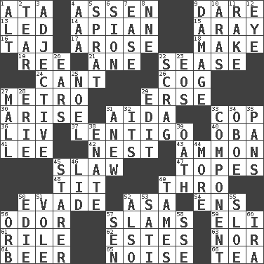 ACROSS 1. "One Day ___ Time" 4. NE Netherlands city 9. Have the gumption 13. Directed 14. Bee-related 15. Like ___ of sunshine 16. _ Mahal 17. Came up 18. Create 19. To separate or throw off 21. One (Scot) 22. Gospel singer Marvin 24. Patter 26. Gear tooth 27. Paris' subway 29. Celtic language 30. Get up 31. Opera by Verdi 33. Police officer (slang) 36. 54 in ancient Rome 37. Small, flat, pigmented spot on the skin 40. Chief or king in Benin or Nigeria 41. Area sheltered from the wind 42. A home for chicks 43. ID or VA city 45. Cole _ (cabbage dish) 47. Drinks excessively 48. Teat (slang) 49. Through, poetically 50. Dodge 52. White ___ sheet 54. Followers of ems 56. Scent 57. Criticizes harshly 59. Biblical high priest 61. Cause heat under the collar 62. _____ Park, CO 63. And not 64. Fermented drink made from hops 65. Annoying sound 66. Beverage made from leaves DOWN 1. Keyboard modifier key 2. Pull into pieces 3. Descriptive word 4. Auto club (abbr.) 5. Small fatty European fish 6. The Jewish people; Israel 7. Relaxation 8. Compass dir. 9. Break 10. Ancient river in northeast Turkey 11. Immoral or dissolute person 12. Sight organ 20. Hearing organs 22. Strangle with an iron collar 23. Greek goddess of the dawn 25. Christmas carol 27. Promenade 28. 4th largest of the Great Lakes 29. Prepare for publication 31. Afresh 32. ___ a Wonderful Life 33. Part 34. Mitch Miller's instrument 35. Baking dishes 38. Maternal 39. Pledge 44. Greater amount 45. A viewer who gazes fixedly 46. Flaplike covering 49. Makes less strong or intense 50. Singer Brickell 51. Short-tailed, large-bodied rat 52. In addition 53. Suttee (variant) 55. _ gin 56. Globe 57. Elected rep. 58. Compass dir. 60. Retirement account (abbr.)