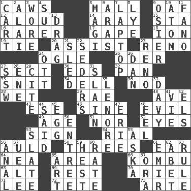 ACROSS 1. Crow sounds 5. Shopping center 9. Clumsy lout 12. Verbally 14. Like ___ of sunshine 15. R.R. building 16. More uncommon 17. Yawn 18. Electrically charged atom 19. Make a knot 20. Help 23. San ____ (Riviera town) 24. Stare 25. Baltic tributary 27. Religious group 30. Begley and Asner 32. Baking dish 33. In a ____ (agitated or irritated) 34. Small valley 36. Allow head to fall sleepily 38. Soggy 39. Actress Charlotte 40. "___ Maria" 43. Compass dir. 46. Trig term 48. Tending to cause great harm 49. Grow older 51. Not either 52. Snake ____ (dice throw) 53. Omen 54. Monetary unit of Yemen 56. Old (Scot.) 58. Triads 61. Ewer handle 64. Teachers' org. 65. Length times width 66. Dried seaweed eaten as food 68. Keyboard modifier key 69. Respite 70. Satellite of Uranus 71. Area sheltered from the wind 72. Wig 73. Johnson of "Laugh-In" DOWN 1. Haul 2. Jai _ 3. Had on 4. Institute legal proceedings 5. Wise men 6. Caspian sea tributary 7. Portable computer 8. Sodium hydroxide 9. Flexible twig of a willow tree 10. Tiny particle 11. Papal veil 13. To trail on the ground 21. Downhill vehicle 22. Spring feasts 23. Western Nevada city 24. Baseball player Mel 26. One of the 12 tribes of Israel 27. Compass dir. 28. Compass dir. 29. Quote 31. Killed 35. Poe poem 37. _ Jones' Locker 41. Compete 42. Raised railways 44. Alleged 45. Ovum 47. 4th largest of the Great Lakes 48. Snakelike fish 50. Main course 53. Schedule 55. "____ silly question..." 56. Of or related to the anus 57. Ubangi River tributary 59. Command 60. Assign a rank or rating to 61. Independent ruler or chieftain 62. Collude with 63. General guideline 65. Nonscientific branch of learning 67. Mouth or opening
