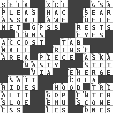 ACROSS 1. Bristle 5. One more than ninety 8. Girls' org. (abbr.) 11. Entreaties 13. Big _ 14. Shrivel 15. Slender Brazilian palm 16. Deep reverence 17. Ubangi River tributary 18. Fish or hair follower 19. Global Positioning Systems (abbr.) 21. Musical pauses 22. Lodging establishments 24. Sight organs 25. Buttonhole 27. Keyboard key 29. Shopping center 30. Remove soap 32. Type of rug 33. Part 35. "____ silly question..." 39. Smutty 41. Proofreading order 42. By way of 43. Develop 45. Suttee (variant) 48. Root beer relative 49. Amusement-park features 50. Parka part 52. Three (prefix) 55. Set down 56. Grand Old Party 57. Keyboard key 59. _ gin 60. Australian flightless bird 61. Biscuitlike quick bread 62. Double-curved letter 63. French article 64. Singles DOWN 1. Connect, as a bridge 2. Otherwise 3. One of the two male reproductive glands 4. American Automobile Association (abbr.) 5. Dec. holiday 6. Crow sounds 7. Frozen water 8. Honkers 9. Table seasonings 10. Ancient Greek god of war 12. Public displays of written messages 14. Chop _ 20. Pacific Standard Time (abbr.) 21. Confederate soldiers (slang) 23. Pitcher Ryan 25. Nursemaid (var.) 26. 4-wheeled motor vehicle 27. Nervous spasm 28. One (Scot) 30. Marina Del _, California 31. Artist's stand 33. 23rd letter of the Greek alphabet 34. Call ___ day 36. Ski resort town in Vermont 37. Barrel 38. Had dinner 40. Advice 43. Environmental prefix 44. Methods 45. Beverly of Met fame 46. Goodbye (Sp.) 47. False hair 49. Raze (variant) 50. Residence 51. Musical composition 53. French philosopher Descartes 54. Angers 56. Set 58. Non-commissioned officer (abbr.)