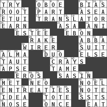 ACROSS 1. Attempt 4. Mitch Miller's instrument 8. Prejudice 12. Carrot, for example 14. Component 15. Toward the sea 16. Needle case 17. Interpreter 20. Merit 21. White ___ sheet 22. Black tropical American cuckoo 23. First name in cosmetics 27. Inky black, to poets 29. Libertine 31. Swedish rock group 34. One who wires 35. Set or collection 36. _ mater 39. Superhero pair 41. Otherwise 42. Strained 43. Trading vessels 46. Domed church section 47. Docile 48. Greek god of love 51. Indian antelope 54. Was introduced to 56. Modern: prefix 58. Christmas carol 61. Pleas 66. Brief written record 67. It may be bright or harebrained 68. Lug 69. Fast planes 70. Sense of smell 71. At one time in the past 72. Consume DOWN 1. Family _ (genealogy) 2. Round or rotation of duties 3. You are 4. Elect 5. Soap unit 6. Mouth or opening 7. Inactive volcano in Sicily 8. Sound made by sheep 9. Byzantium, centuries later 10. Period of immesurable duration 11. Indian skirt 13. Metal containers 18. Compass dir. 19. Experiment locale 24. Three (prefix) 25. Ewer handle 26. Supplemented with great effort 28. Fertile tracts in a desert 30. Spew [out] 32. Again 33. Had dinner 34. Wetness 36. "One Day ___ Time" 37. Pet locale 38. French bagpipes 40. Mouths or openings 44. Nanny (var.) 45. Affirmative reply 49. Single 50. Ocean 52. Restaurants 53. Trap for birds or small mammals 54. Count _ (2 wds.) 55. Inside; within (prefix) 57. Von Bismarck 59. Singer James 60. For fear that 62. Actress Charlotte 63. Electrically charged atom 64. And so on (abbr.) 65. Observe