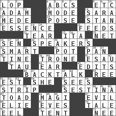 ACROSS 1. Trim (branches) 4. Lettered men learn these first 8. And so on (abbr.) 11. First of billions? 13. Method 14. "Two Mules for Sister ____" 15. Ancient Persian 16. Airs 17. Comedian Laurel of Laurel & Hardy 18. Center 21. Eats 22. Pull apart 23. Call ___ day 25. Fish or hair follower 26. Elected rep. 29. Orators 32. Don Adams' spy role 34. Cooking vessel 35. Baking dish 38. Prong on a fork 39. Marketplace scale 41. Son of Isaac 43. The 19th letter of the Greek alphabet 44. Hearing organ 45. Prepares for publication 46. Sass 50. To riddle 51. Eastern Standard Time (abbr.) 54. A female animal or person 55. Observes 57. Empty completely 59. French poetic form 63. Frog relative 64. Wise men 67. Morally bad or wrong 68. Writer Wiesel 69. Nights before holidays 70. Story 71. Snakelike fish 72. Portable shelter 73. Born DOWN 1. Unable to walk 2. Lyric poems 3. Groovy apts. 4. Electrical Unit 5. Oct. 31 cry 6. Music discs 7. Perceive with the eye 8. Eroded 9. Buy and sell 10. 2nd pers. sing. pres. of can (arch.) 12. Rendezvous 14. Compass dir. 19. Egg locale 20. Head covering 21. Distant 23. Image 24. False hair 26. Fast jet (abbr.) 27. Send forth 28. Grandmother 30. To the left, to Queeg 31. Moved rapidly 33. Reuben's nickname 36. SW Saudi Arabia district 37. Nathan's nickname 39. Georgia ____ (Atlanta school) 40. Immoral or dissolute person 42. Purpose 45. Supplements with great effort 47. Cleo's killer 48. Help 49. Area sheltered from the wind 51. First name in cosmetics 52. Took without asking 53. Go after with the intent to catch 56. Proofreading order 58. Binary compound 60. _ the terrible 61. "Death on the ____" 62. Toward shelter 64. Was introduced to 65. "___ Maria" 66. Commissioned mil. rank
