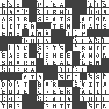ACROSS 1. Compass dir. 4. Entreaty 8. It is 11. Moist 13. High-altitude cloud 15. ___ good deed 16. SW Saudi Arabia district 17. Arguments over trivial matters 18. A really long time 19. 61 cubic inches 21. "___ Little Indians" 22. Floor coverings 23. Followers of ems 24. _ tizzy (2 wds.) 27. Uncastrated adult male sheep 29. Lyric poems 30. Gospel singer Marvin 34. 54 in ancient Rome 36. Fast planes 39. Bert's buddy 40. Relaxation 41. Giggle 43. At once, immediately (arch.) 44. Excessive but superficial compliments 46. Actress Patricia 47. Commissioned military rank (abbr.) 48. Father Junipero _ 49. Become fatigued 51. _ moment's notice (2 wds.) 53. Observe 54. Compass dir. 57. Do not 60. Tavern 63. Webber/Rice musical 65. Singer Brickell 66. Small stream 69. Set down 70. Police officer (slang) 71. Any of the three canals of the cochlea 72. Lacquered or enameled metalware 73. Big collection agency 74. Stricken, poetically 75. Elected rep. DOWN 1. Peak District village in England 2. Indian antelope 3. Gives off 4. Personal Computers (abbr.) 5. Mouth edge 6. Part of Q.E.F. 7. Johnson of "Laugh-In" 8. The main thing one is thinking about 9. A blast of a horn 10. Without 12. Before (prefix) 14. Is not 18. Electrical Measurement 20. To free from 25. A home for chicks 26. NE Netherlands city 28. Purpose 29. Make much ado about nothing 31. Singer Murray 32. The Jewish people; Israel 33. Car or cant ending 34. Unable to walk 35. Austrian river, tributary to the Danube 37. Definite Article 38. Theater features 40. Curvy letter 42. Writer Wiesel 45. Floor protector 50. Portuguese money of account (variant) 52. Lettered men learn these first 54. Grain storage towers 55. Vertical member of a panel or frame 56. Consumed 57. Tenth: prefix 58. Aroma 59. Pinches, bites 61. Curves 62. 480, 500 or 516 sheets of paper 64. Large container 67. Biblical high priest 68. Krazy ___ of comics