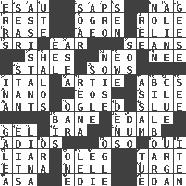 ACROSS 1. Son of Isaac 5. Plant excrements 9. Tired old horse 12. Take ten 13. Legendary monster 14. Hero or heavy, e.g. 15. Raze (variant) 16. Period of immesurable duration 17. Writer Wiesel 18. Indian title of respect (Mr.) 19. Hearing organ 21. Seines 22. "______ My Girl" (Turtles hit) 24. Modern: prefix 26. Born 27. Lacking originality or spontaneity 28. Sty mamas 29. Slanted text style (abbr.) 30. Nick name for Arthur 32. Lettered men learn these first 36. Billionth: prefix 37. Greek goddess of the dawn 38. Filth; sediment 39. Pismires 40. Stared at amorously 42. Change direction abruptly 43. Object of repulsion 44. Peak District village in England 46. Set 49. Retirement account (abbr.) 50. Unfeeling 51. Goodbye (Sp.) 53. Bear (Spanish) 54. Fr. "Yes" 57. One who doesn't tell the truth 58. Cassini of fashion 61. Small pie 62. Inactive volcano in Sicily 63. 1994 drama film starring Jodie Foster 64. Goad 65. White ___ sheet 66. Singer Brickell 67. Dutch treat DOWN 1. Blunders 2. Scorch 3. Helper 4. Shoshoni 5. Fly high 6. Grow older 7. Adept person 8. Elected rep. 9. Pitcher Ryan 10. Place in a line 11. Honkers 14. To separate or throw off 19. Snakelike fish 20. Toward the sea 21. Distress signal 23. Radiant circles of light 24. Annoying sound 25. She-sheep 27. Comedian Laurel of Laurel & Hardy 28. Fur scarf 29. _ tizzy (2 wds.) 31. Rain (Swedish) 32. Indian state 33. Big road sign 34. A slight indication 35. Observe 40. Rowing implement 41. Lairs 43. Twice 45. Superhero pair 46. An organ shaped like a helmet 47. Prepares for publication 48. Climbing, woody, usually tropical vines 52. Mouth or opening 53. Stare at amorously 55. Capital and largest city of Mongolia 56. A whole individual unit 58. Single 59. Directed 60. Connecticut Ivy Leaguer 61. Third day of the wk.