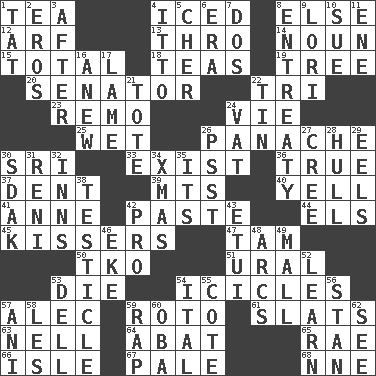 ACROSS 1. Afternoon social gathering 4. On the rocks 8. Otherwise 12. Sandy's bark 13. Through, poetically 14. Part of speech 15. "_____ Recall" 18. Beverages made from leaves 19. Family _ (genealogy) 20. Elected representative 22. Three (prefix) 23. San ____ (Riviera town) 24. Compete 25. Dripping 26. Flamboyance 30. _ Lanka 33. Be 36. Loyal 37. Incision 39. Mountains (abbr.) 40. Shout 41. Singer Murray 42. Thick mixture 44. Raised railways 45. Smoochers 47. Scottish cap 50. Ring climax 51. Mountain range 53. Expire 54. Winter's stalactites 57. Actor Baldwin 59. Printing process, for short 61. Narrow boards 63. 1994 drama film starring Jodie Foster 64. Blind as ____ 65. Actress Charlotte 66. Small island 67. Diluted with white 68. Compass dir. DOWN 1. Make lace 2. Greek god of love 3. Following 4. "Tell ____ the Marines!" 5. "Mermaids" star 6. Epoch 7. Two (Sp.) 8. Plea 9. Australian parrot (variant) 10. Institute legal proceedings 11. Compass dir. 16. Afresh 17. Unable to walk 21. Haul 22. Shallow baking pan 24. Large container 26. Inconspicuous attention getter 27. Algonquian 28. Frame or body of a ship 29. Snakelike fish 30. Neighbor of Neb. 31. Painter Guido (1575-1642) 32. Taverns 34. Dec. holiday 35. ___ a Wonderful Life 38. One of the two male reproductive glands 42. Adept person 43. Needle holder 46. Supplement with great effort 48. Curves 49. Promenade 52. Acquire or gain knowledge or skills 53. Small valley 54. Slanted text style (abbr.) 55. ____ d'Azur (French Riviera) 56. Comedian Laurel of Laurel & Hardy 57. Black tropical American cuckoo 58. French article 59. Hit sharply and swiftly 60. Chief or king in Benin or Nigeria 62. Observe