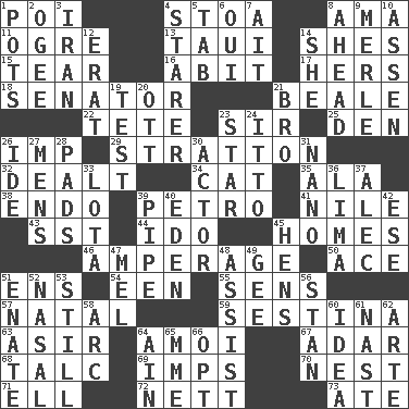ACROSS 1. Luau course 4. Portico 8. Housemaid (var.) 11. Legendary monster 13. "Change" in Tahitian 14. "______ My Girl" (Turtles hit) 15. Pull apart 16. "This won't hurt ____!" 17. Possessive pronoun 18. Legislator 21. Calif. Air Force Base 22. False hair 23. Title for a knight 25. Lair 26. Mischievous child 29. Ski resort town in Vermont 32. Started a card game 34. Feline 35. Insect wing 38. Inside; within (prefix) 39. Stone: prefix 41. Mediterranean tributary 43. Fast jet (abbr.) 44. Wedding promise 45. Dwellings 46. Electrical Measurement 50. Adept person 51. Followers of ems 54. Car or cant ending 55. Elected reps. 57. Relating to or accompanying birth 59. French poetic form 63. SW Saudi Arabia district 64. Mine, in Marseilles 67. The sixth month of the Jewish calendar 68. Baby powder 69. Naughty children 70. A home for chicks 71. Pipe bend 72. Remaining after all deductions 73. Had dinner DOWN 1. Cooking vessels 2. Double curve, resembling the letter S 3. SW Asia republic 4. A viewer who gazes fixedly 5. Keyboard key 6. Fr. "Yes" 7. Small island 8. At or in the front 9. Haggard of country music 10. NE Netherlands city 12. Part of Q.E.F. 14. A female animal or person 19. Trial 20. Baseball player Mel 21. Sis' sibling 23. Play the lead 24. "Tell ____ the Marines!" 26. Binary compound 27. Not women's 28. Groovy apts. 30. Thespian 31. Billionth: prefix 33. Globular water bottle used in Asia 36. Pale green bean 37. Actor Baldwin 39. Corncob 40. Genesis locale 42. Compass dir. 45. Coop moms 47. Cartoonist voice _ Blanc 48. Aid 49. Unit of force equal to gravity 51. Maternal 52. Rhinal 53. Free of sound 56. Comedian Laurel of Laurel & Hardy 58. Curve 60. It may be bright or harebrained 61. Political cartoonist Thomas 62. Johnson of "Laugh-In" 64. The 18th letter of the Arabic alphabet 65. Madame (abbr.) 66. Elect