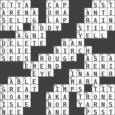 ACROSS 1. Singer James 5. Head covering 8. Fast jet (abbr.) 11. Sports stadium 13. Mouth or opening 14. Opposed to 15. Major League Baseball Commissioner Bud 16. Pet locale 17. Precipitation 18. Snakelike fish 19. Whirlpool 21. Vertical member of a panel or frame 22. Hindu god of fire 24. Shout 25. Erase 27. Bar 29. Migrant worker of the '30s 30. A tree used for making furniture 32. Observes 33. Makeup applied to the cheeks 35. Toward the sea 39. Make improvements or corrections to 41. Painter Guido (1575-1642) 42. Sight organ 43. More lacking in sense or substance 45. Competent 48. Hindu Mythology: god of death 49. Relatively large 50. Naughty children 52. Teat (slang) 55. Wander aimlessly 56. Alias (abbr.) 57. Marketplace scale 59. Small island 60. Or not 61. Tall tales 62. Born 63. A saturated hydrocarbon 64. Inconspicuous attention getter DOWN 1. Relaxation 2. Relationship diagram 3. Copy Pinocchio 4. Black tropical American cuckoo 5. Having a low temperature 6. Like ___ of sunshine 7. Infant food 8. Slow-paced one 9. Free of sound 10. Prong on a fork 12. Rep 14. Johnson of "Laugh-In" 20. Pass on 21. Synchronize (abbr.) 23. Honkers 25. Two (Sp.) 26. Make supply last 27. Large 28. "We ___ not amused" (Victoria) 30. Partially opened flower 31. Ethiopian city, capital of Harari 33. Marina Del _, California 34. Single 36. Elected representatives 37. Compass dir. 38. Wind 40. Rendezvous 43. Mischievous child 44. Smutty 45. Came up 46. Calif. Air Force Base 47. Unable to walk 49. Broad smile 50. Picture 51. Female horse 53. Taverns 54. Trial 56. Santa ___, CA 58. Strike