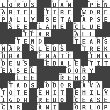 ACROSS 1. Domineers 6. One of the 12 tribes of Israel 9. Writing instrument 12. Satellite of Uranus 13. Hoop that covers a wheel 14. Had on 15. Chummy 16. Bristle 17. Domed church section 18. Perceive with the eye 19. Unable to walk 20. A slight indication 21. Separate forcefully 23. Everything 24. Look after 25. Lacerates 28. Impair 30. Bobsleighs 34. Long journey 35. Mouth or opening 36. Maternal 38. _ tizzy (2 wds.) 39. Lairs 41. Peak District village in England 43. Teat (slang) 44. Artist's stand 46. Small, narrow, flatbottom fishing boat 48. Area sheltered from the wind 49. Former U.S. Attorney General Janet 50. Small amounts or degrees 51. Scent 53. Actress Gardner 56. Haul 57. Give off 58. Poet Dickinson 60. Composer Stravinsky 61. Redecorate 62. Stop 63. 4-wheeled motor vehicle 64. Cuckoo 65. Fourth or lowest deck DOWN 1. Pet locale 2. Mouths or openings 3. Cause heat under the collar 4. Keyboard key 5. Stealthy 6. South Vietnam president (1954) 7. Johnson of "Laugh-In" 8. Teachers' org. 9. Teen's desire 10. Celtic language 11. Born 13. Russian ruler of old 14. Place for singles 19. Dipping utensil 20. Domesticated feline 22. Followers of ems 24. Interpreter 26. Painter Guido (1575-1642) 27. Three-handed card game 28. Method 29. Length times width 31. Compass dir. 32. June honoree 33. R.R. building 37. A person who is older than you are 40. Sowing specialist 42. Period of immesurable duration 45. French article 47. Nomad 49. Printing process, for short 50. Ancient Roman robe 51. Sign of something about to happen 52. "You Light Up My Life" star Conn 54. Small bottle 55. In addition 56. Nervous spasm 57. Period 58. Environmental prefix 59. Slangy assent