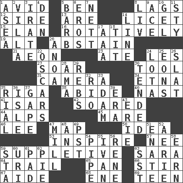 ACROSS 1. Enthusiastic 5. Benjamin's nick name 8. Fails to keep up a pace 12. Father 13. "We ___ not amused" (Victoria) 14. It is permitted: Lat. 15. Enthusiasm 16. Happening in regular succession 19. The first octave above the treble staff 20. Refrain by choice 21. Age 23. Had dinner 24. French article 27. Fly high 30. Instrument 31. Device for capturing images 34. Inactive volcano in Sicily 35. Capital of Latvia 38. Remain 40. Political cartoonist Thomas 41. Austrian river, tributary to the Danube 42. Flew 44. High mountains 45. Female horse 46. Area sheltered from the wind 47. Atlas unit 50. It may be bright or harebrained 53. Heighten or intensify 57. Born 59. Supplementary 63. "Two Mules for Sister ____" 64. Drop behind 65. Baking dish 66. Tumult 67. Assistant 68. Compass dir. 69. Adolescent DOWN 1. Toward the sea 2. Country estate 3. Feeling or showing extreme anger 4. Lair 5. Sharp remark 6. Greek god of love 7. Remaining after all deductions 8. 54 in ancient Rome 9. Adept person 10. Set 11. Filthy place 14. Actor's bit 17. Auto club (abbr.) 18. Teat (slang) 20. Small Philippine buffalo 22. Motion picture awards 24. Globular water bottle used in Asia 25. Immeasurably long periods of time 26. Narrow board 28. Nanny (var.) 29. Confederate soldiers (slang) 30. Watched over 32. _ de Janeiro 33. First man 35. Monetary unit of Yemen 36. Small island 37. Yawn 39. Epoch 43. 4th largest of the Great Lakes 47. Place where flour is made 48. A saturated hydrocarbon 49. Pacific Standard Time (abbr.) 51. Related on the mother's side 52. Nest on high 54. Corncob 55. _ the terrible 56. French philosopher Descartes 58. Merit 59. R.R. building 60. RI univ. 61. Groovy apt. 62. Sliced dessert 63. Fast jet (abbr.)