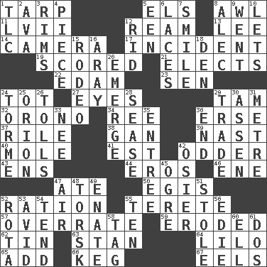 ACROSS 1. Canvas cover 5. Raised railways 8. Leather borer 11. 57 in ancient Rome 12. 480, 500 or 516 sheets of paper 13. Area sheltered from the wind 14. Device for capturing images 17. Event 19. Tallied 21. Opts 22. Dutch treat 23. Elected rep. 24. Small child 27. Sight organs 29. Scottish cap 32. U. of Maine site 34. To riddle 36. Celtic language 37. Cause heat under the collar 38. Separate the seeds from cotton 39. Political cartoonist Thomas 40. Undercover agent 41. Eastern Standard Time (abbr.) 42. More peculiar 43. Followers of ems 44. Greek god of love 46. Compass dir. 47. Had dinner 50. The front part of a cuirass 52. Food allowance for one day 55. Cylindrical with tapered ends 57. Make much ado about nothing 59. Eaten away 62. Shallow baking pan 63. Comedian Laurel of Laurel & Hardy 64. _ and Stitch 65. Find the sum of 66. Barrel 67. Snakelike fish DOWN 1. Affectionate concern, for short 2. Actress Gardner 3. Basketball hoops 4. Component 5. Car or cant ending 6. Shoestrings 7. Grin 8. Actor Baldwin 9. Gone 10. Allows 12. To free from 15. Cowboy competition 16. Like ___ of sunshine 18. Lair 20. Develop 24. Singer Mel 25. Constellation of myth 26. For Whom the Bell _____ 28. Gospel singer Marvin 29. Buy and sell 30. NE Netherlands city 31. Distance measurement (Brit.) 33. Born 35. Main course 36. Conclude 42. Flexible twig of a willow tree 45. Legendary monster 47. Wind 48. Cod relative 49. Related on the mother's side 51. Took without asking 52. Roll call or roster of names 53. Enthusiastic 54. Look after 55. Nine, plus one 56. Singer Brickell 58. Label 60. Pipe bend 61. Two (Sp.)