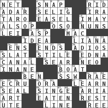 ACROSS 1. Fish or hair follower 4. Fastener 8. To free from 11. The sixth month of the Jewish calendar 13. Major League Baseball Commissioner Bud 15. Retirement account (abbr.) 16. Pacific island yam 17. Artist's stand 18. "If ____ say so..." 19. Columnist Joseph or Stewart 21. Bear (Spanish) 22. Religious women 23. Luau accessory 24. Viper 27. Apple computer (short form) 29. The main thing one is thinking about 30. Woody, climbing, usually tropical plant 34. Followers of ems 36. Extremities 39. Goodbye (Sp.) 40. Narrow board 41. Vertical member of a panel or frame 43. Pulitzer Prize-winning author Ferber 44. Lessep's creation 46. Dry up 47. Modern: prefix 48. Lacking in sense or substance 49. Water vessel 51. Benjamin's nick name 53. Compass dir. 54. Actress Charlotte 57. Shade of tan 60. Mouth or opening 63. Acquire or gain knowledge or skills 65. Lick closed 66. Scorch 69. Operatic vocal solo 70. Nonscientific branch of learning 71. Consumed 72. Relief 73. Shoshoni 74. Actor's bit 75. Portuguese money of account (variant) DOWN 1. Brizilian seaport 2. Peak District village in England 3. Tarsus (plural) 4. Compass dir. 5. Teachers' org. 6. In addition 7. Sliced desserts 8. Tall New Zealand timber tree 9. SW Asia republic 10. 24-hour periods 12. Friend of Pooh 14. Take by theft 18. Event 20. Groovy apt. 25. Observes 26. Leg coverings 28. Insect wing 29. Byzantium, centuries later 31. Helper 32. Words to Nanette 33. White ___ sheet 34. Style 35. Grandmother 37. Pass on 38. Thick slices 40. _-fi 42. Greek god of love 45. Area sheltered from the wind 50. Leather borer 52. Sense of smell 54. Less widely known 55. Originate 56. Related on the mother's side 57. Son of Isaac 58. Sure thing 59. Pace 61. Monetary unit of Yemen 62. Opposed to 64. Hearing organ 67. Commissioned mil. rank 68. Compass dir.