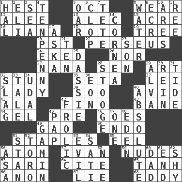 ACROSS 1. Command 5. Sep. follower 8. Erode 12. Toward shelter 13. Actor Baldwin 15. 1/640 square mile 16. Climbing, woody, usually tropical vines 18. Printing process, for short 19. Family _ (genealogy) 20. Pacific Standard Time (abbr.) 22. Son of Zeus who helped slay Medusa 24. Supplemented with great effort 26. And not 27. Grandmother 28. Elected rep. 29. Nonscientific branch of learning 32. Make senseless or dizzy 35. Bristle 37. Flowery wreath 38. Kenny Rogers chart-topper in '80 39. "Barney Miller" actor Jack 40. Enthusiastic 41. Insect wing 42. A pale, very dry sherry 43. Object of repulsion 44. Set 45. Before (prefix) 46. Travels 49. E Mali city 50. Inside; within (prefix) 51. Paper fasteners 55. Snakelike fish 56. Tiny particle 57. _ the terrible 59. Unclothed pictures 63. Indian skirt 64. Quote 65. Hyperbolic tangent 66. Soon (poet.) 67. Untruth 68. Whirlpool DOWN 1. Actor Linden 2. Connecticut Ivy Leaguer 3. Ocean 4. 3-inch nail 5. Boat paddle 6. Hoof sound 7. False hair 8. Wetness 9. Shade of tan 10. Ancient Greek god of war 11. To sift 14. Pupil covering 17. "____ silly question..." 21. Nine, plus one 23. Boy, to dad 25. Small ungulate mammals of Africa 28. Moe Howard, for one 29. Inventor's middle name 30. It's straight from the horse's mouth 31. Periodic rise and fall of the sea level 32. Volcanic refuse 33. Story 34. Hereditary estate 36. Age 40. Utter; complete 42. Romp 45. Infant food 47. Single 48. Paradise 49. Homeless child 51. Comedian Laurel of Laurel & Hardy 52. "Corrida" creature 53. Tending to cause great harm 54. Suttee (variant) 56. White ___ sheet 58. Born 60. Male parent 61. Conclusion 62. Like a shrinking violet